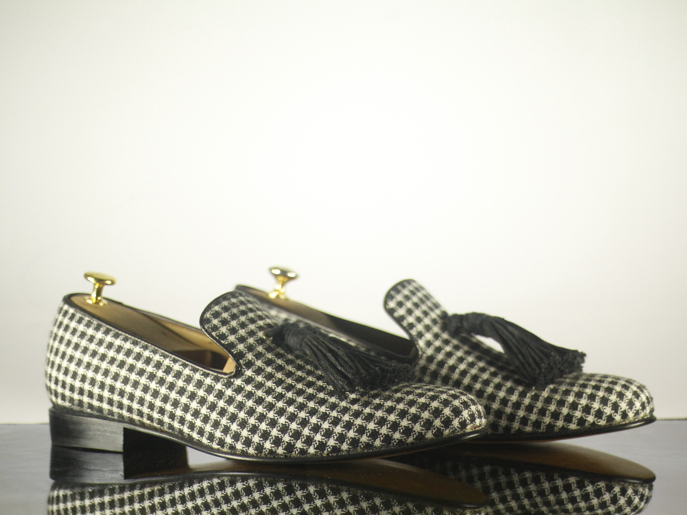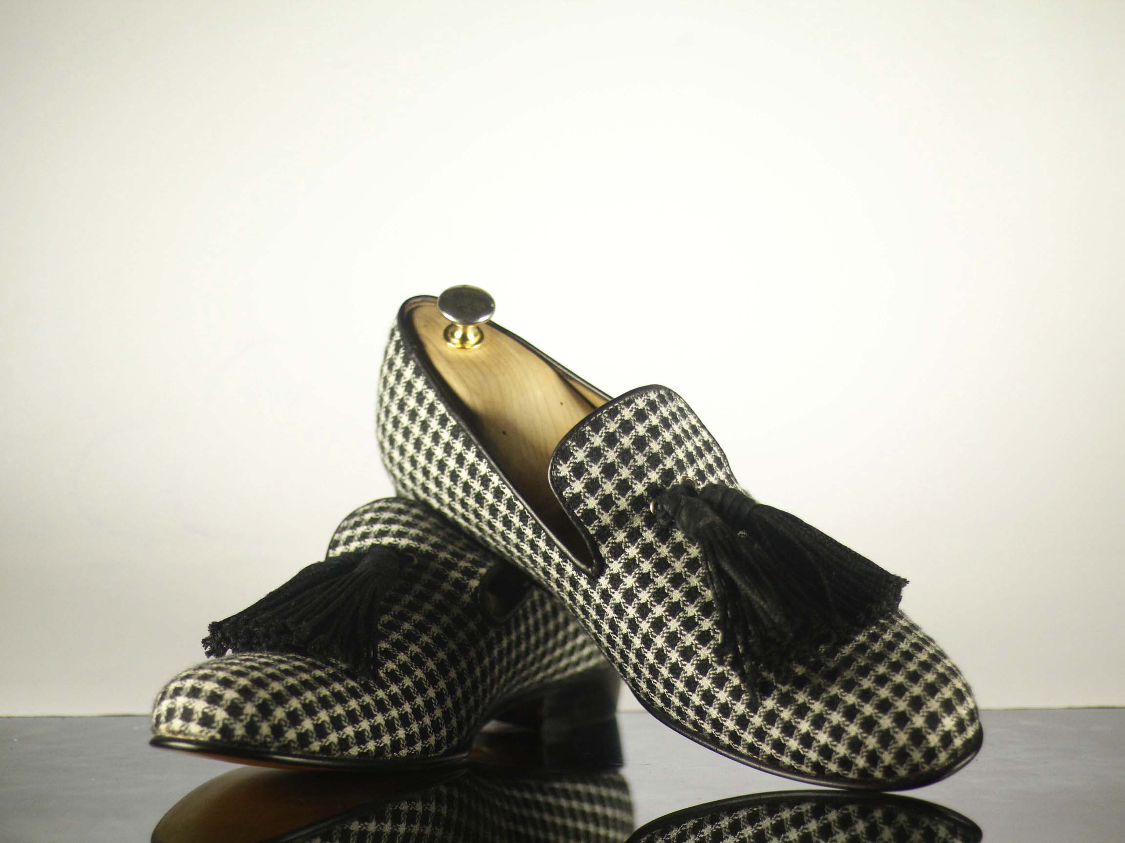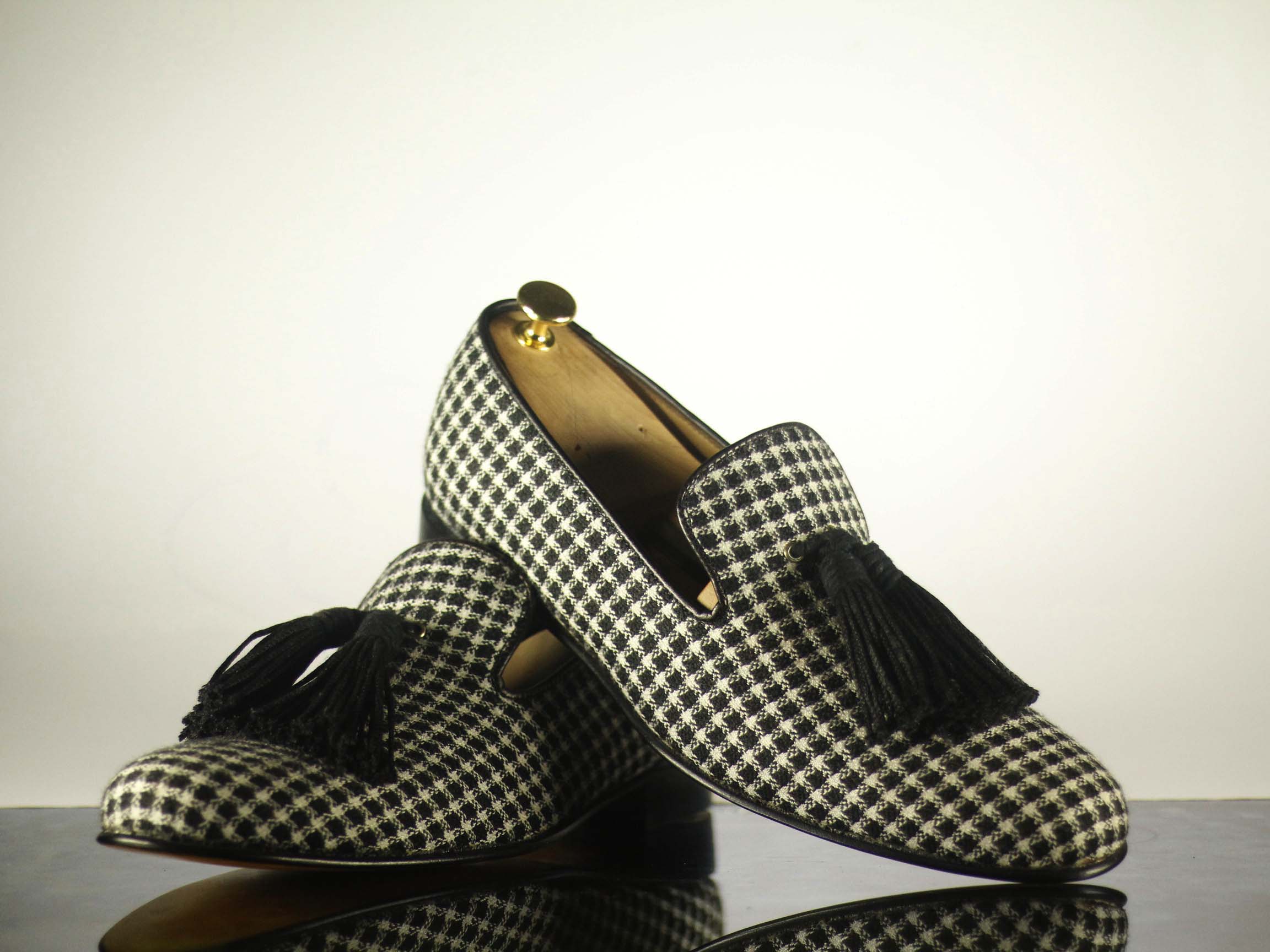 Handmade Black & White Dog Print Tussles Suede Stylish Loafers For Men's