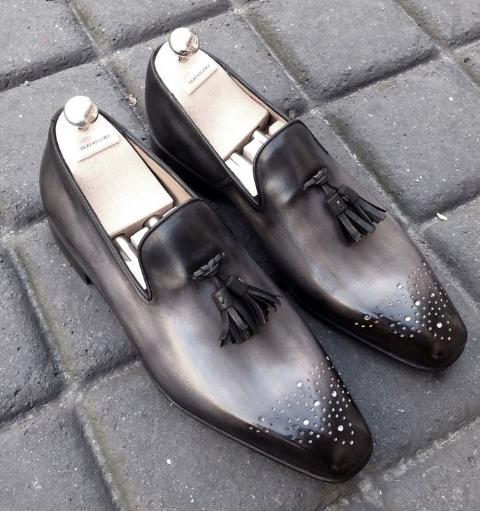New Handmade Men's Casual Gray Brogue Toe Leather Tussles Penny Loafer Shoes