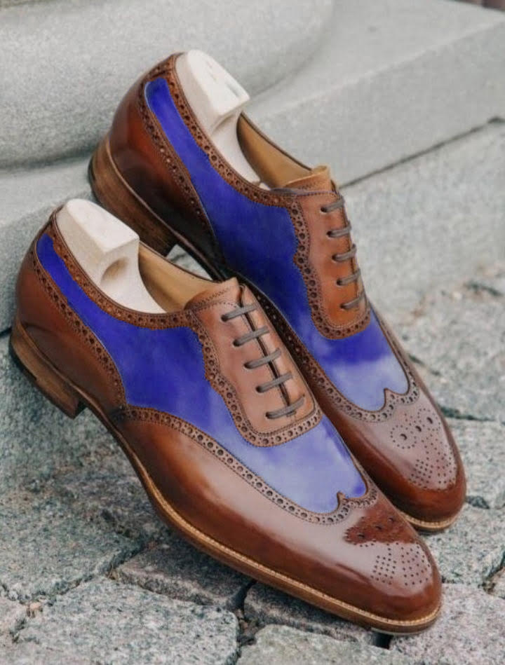 Customize Blue Brown Wing Tip Brogue Oxfords Handmade Formal Wear Shoes