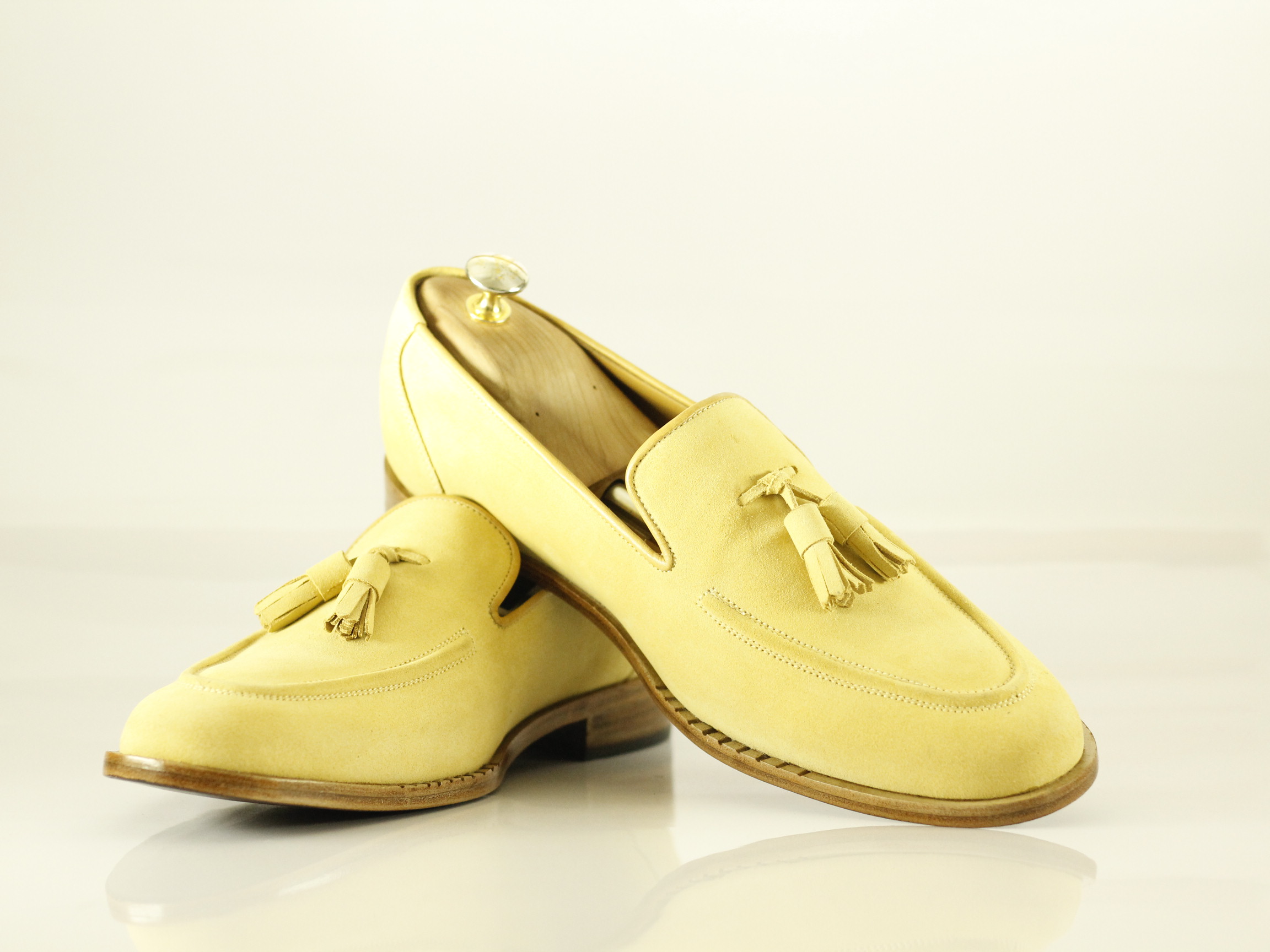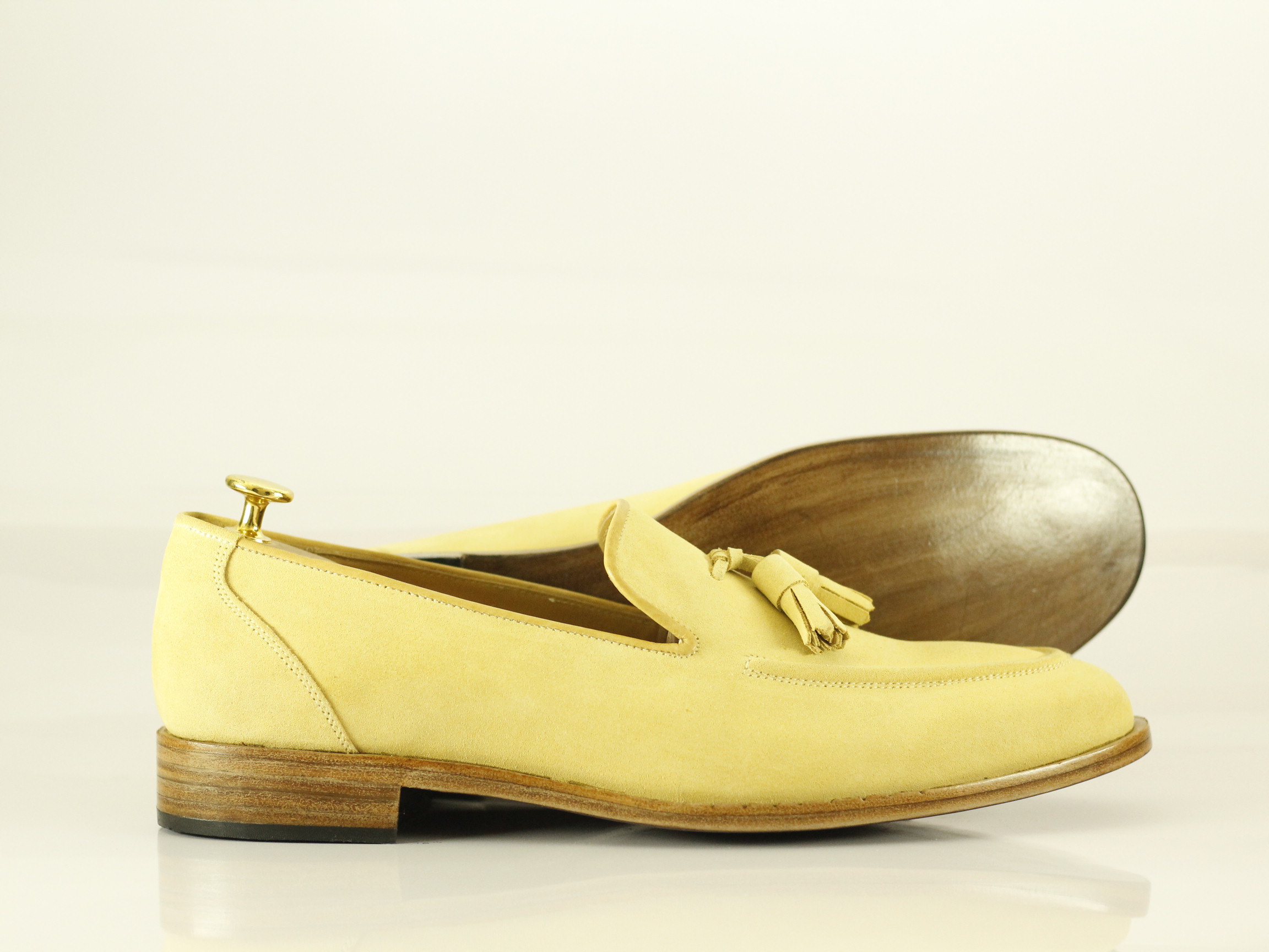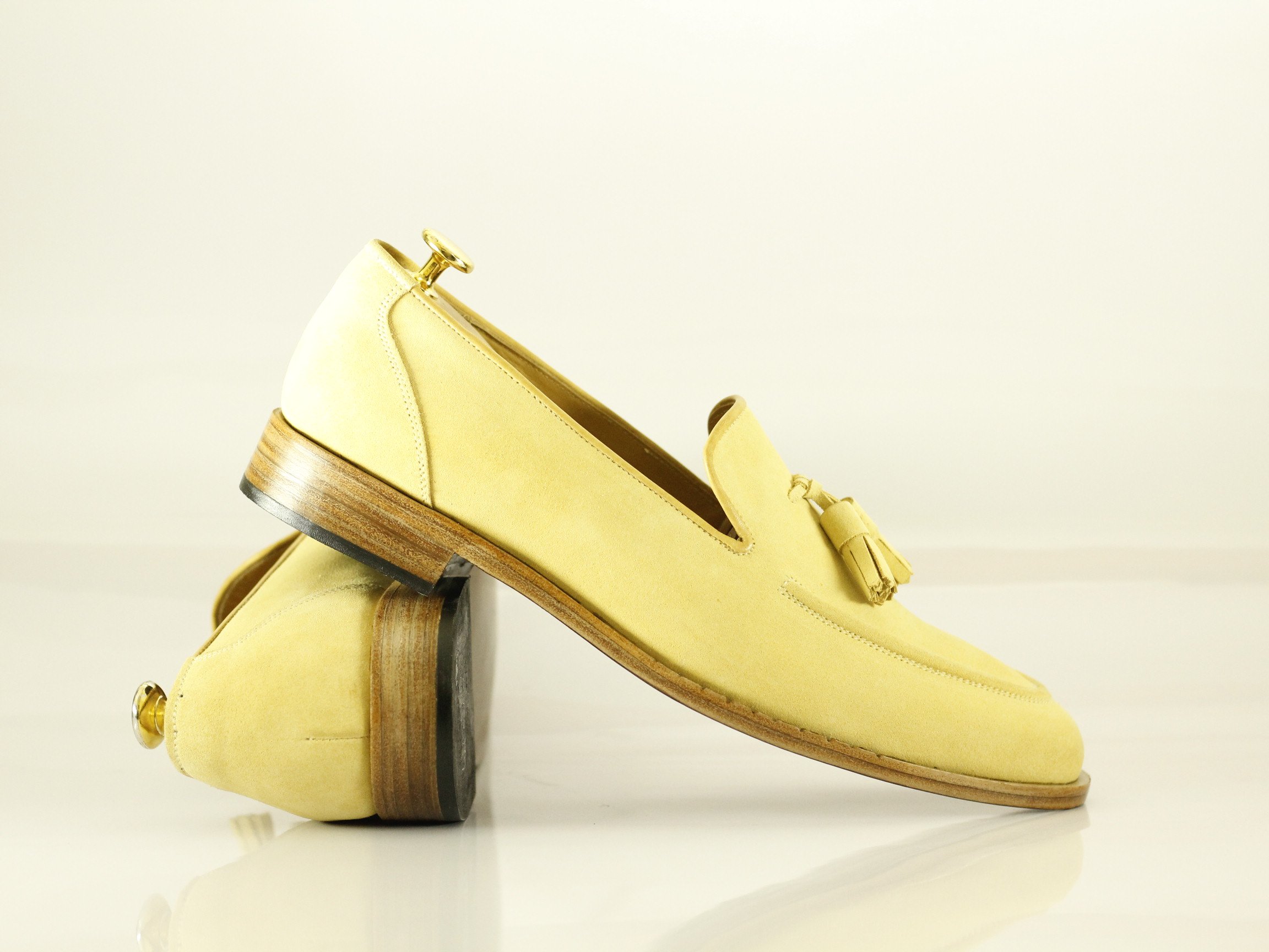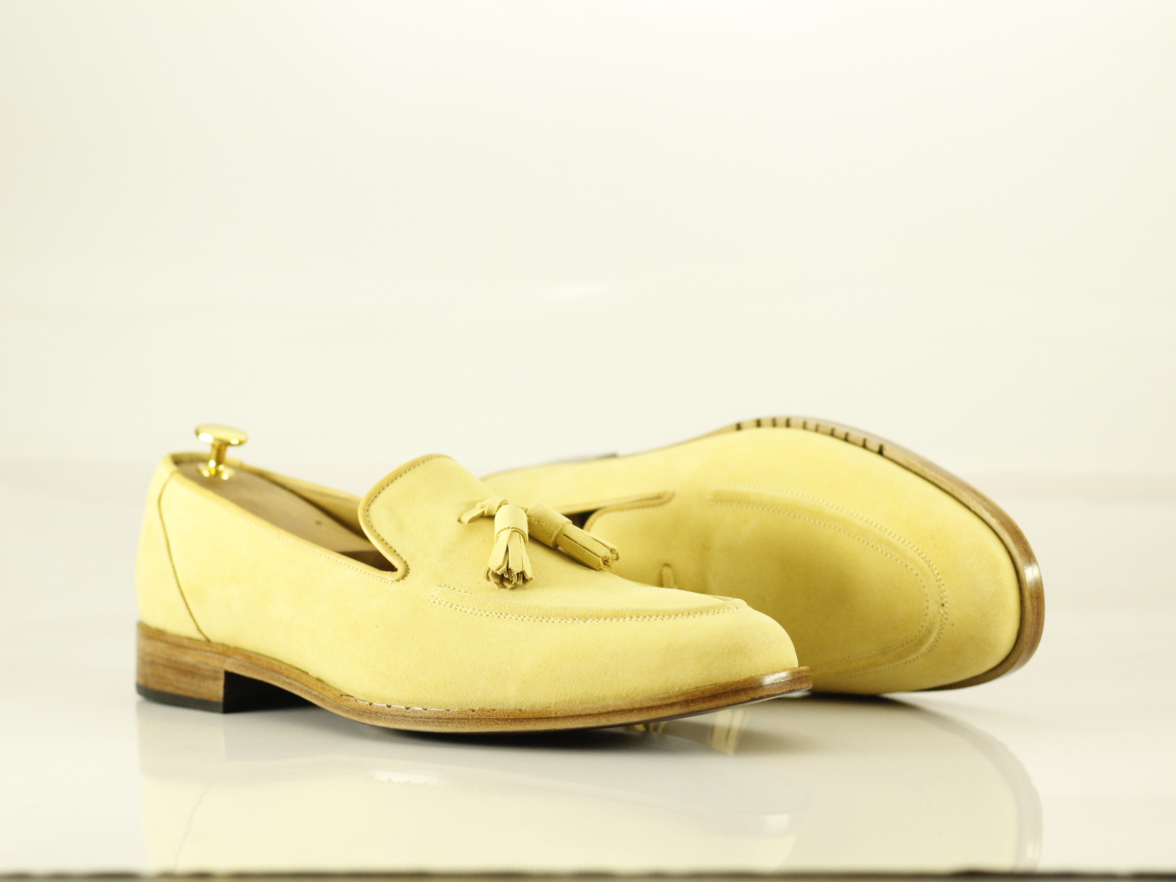 Handmade Mustard Color Round Toe Tussles Loafer Suede Shoes For Men's