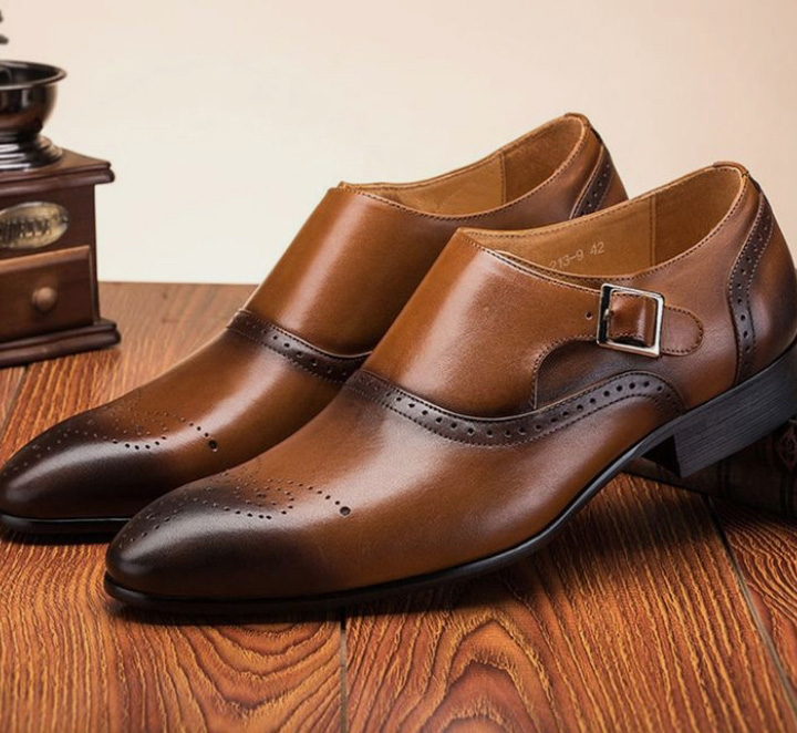 Bespoke Men's Brown Color Single Monk Shoes, Leather Brogue Toe Dress Shoes