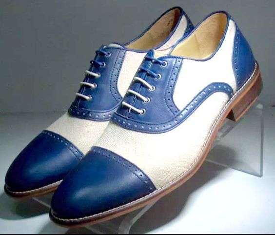 Handmade Men's Blue & White Cap Toe Lace Up Shoes, Real Leather & Suede Dress Shoes