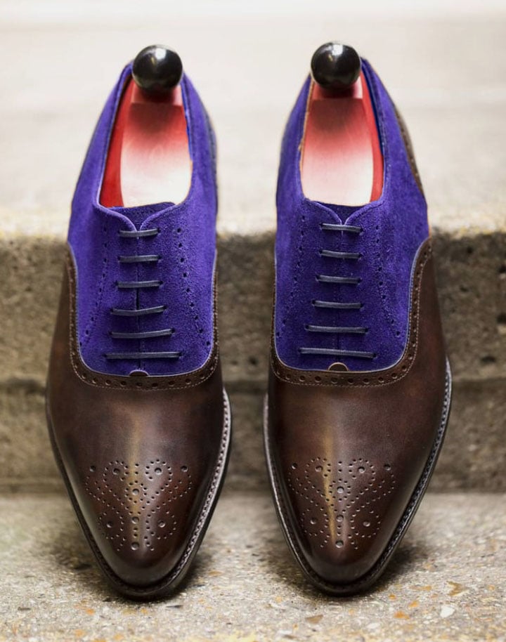 Handmade Men's Brown & Blue Color Leather & Suede Brogue Toe Shoes, Men's Dress Lace Up Shoes