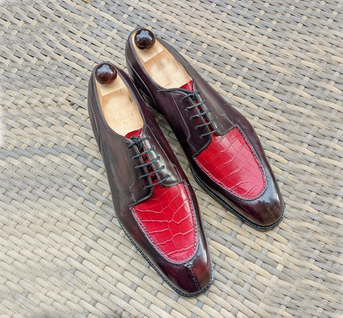 Handmade Two Tone Alligator Texture & Leather Shoes, Spectator Lace Up Shoes