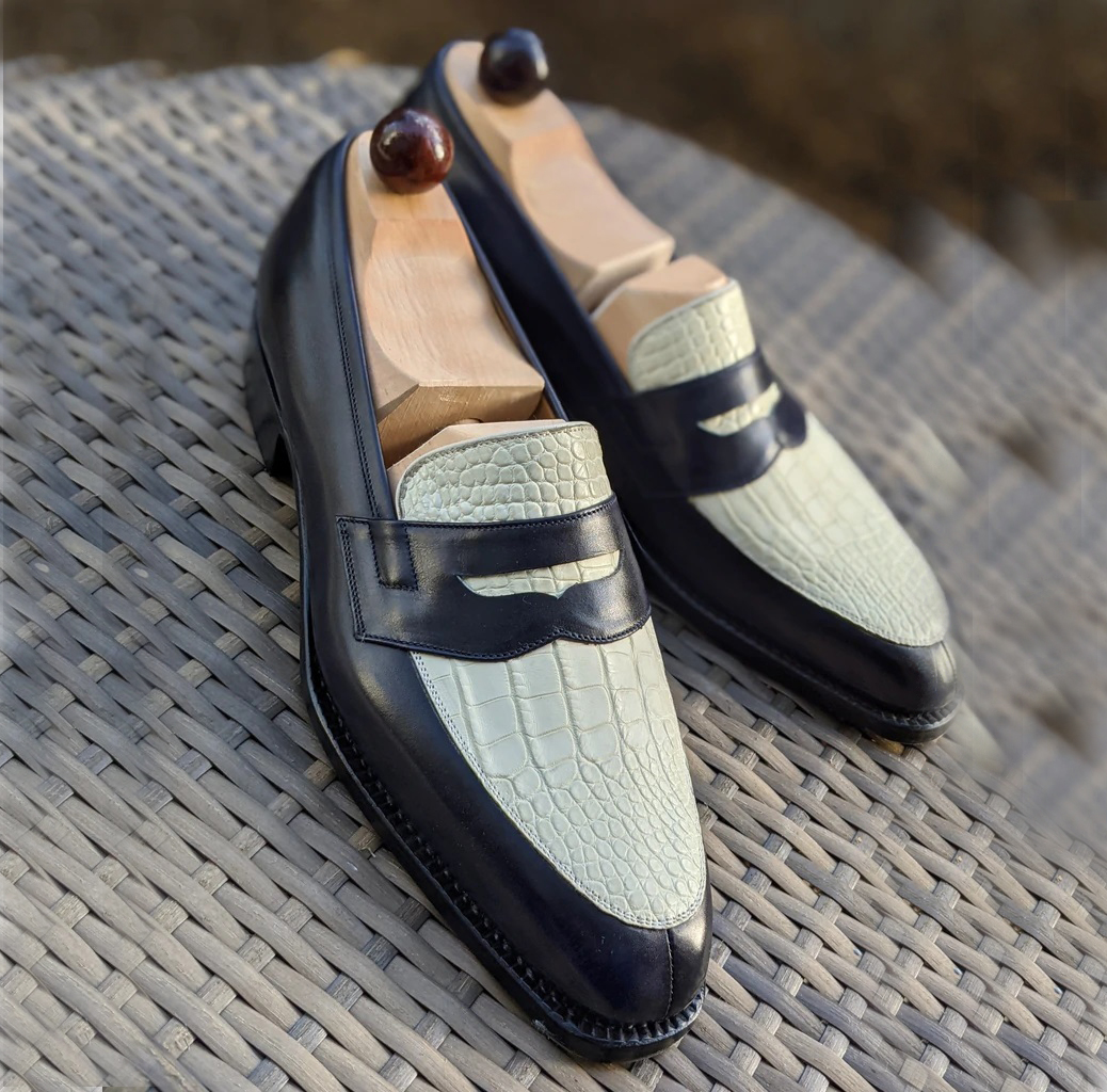 Hand Painted Alligator Texture & Leather Shoes , Slip On Penny Loafer Shoes