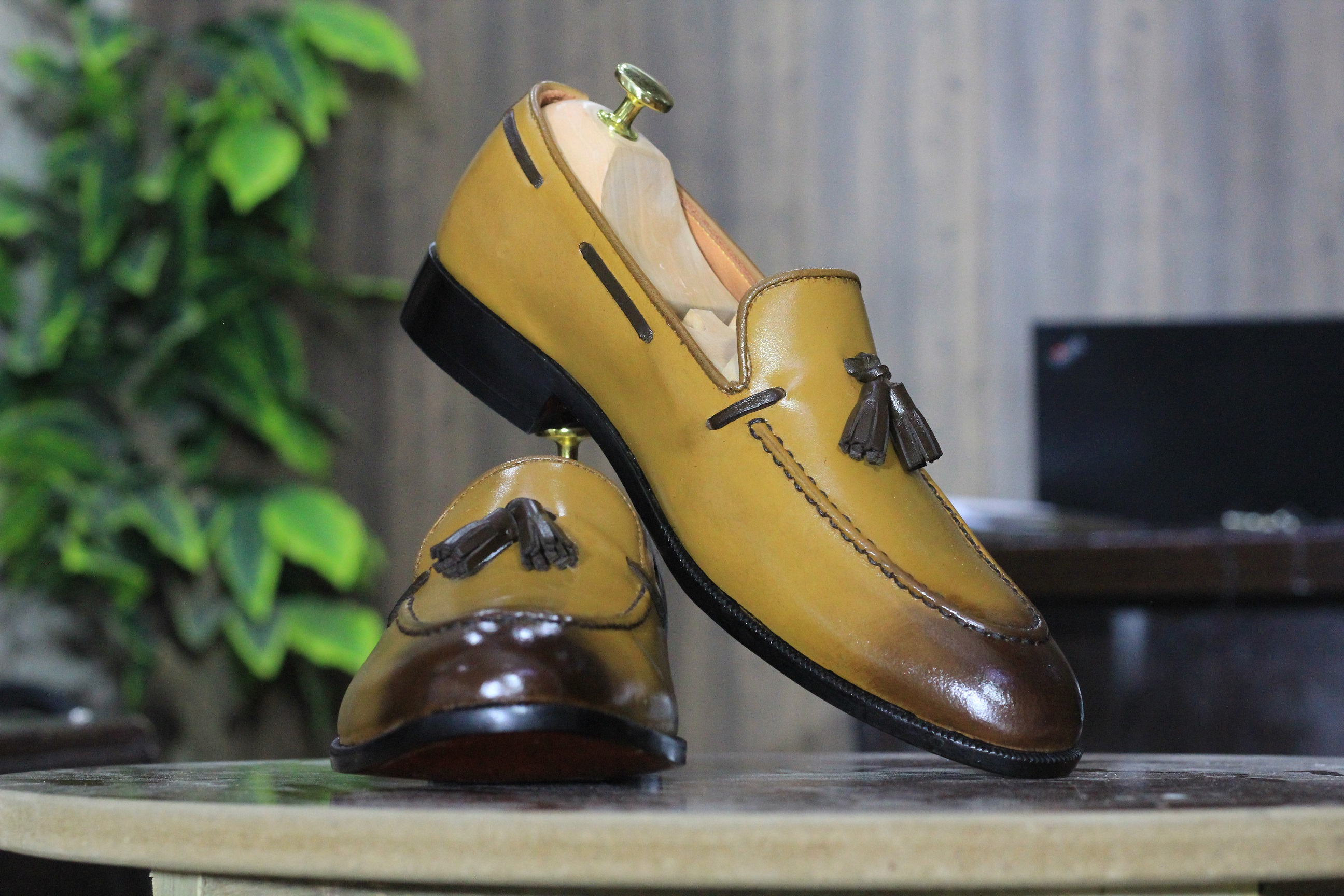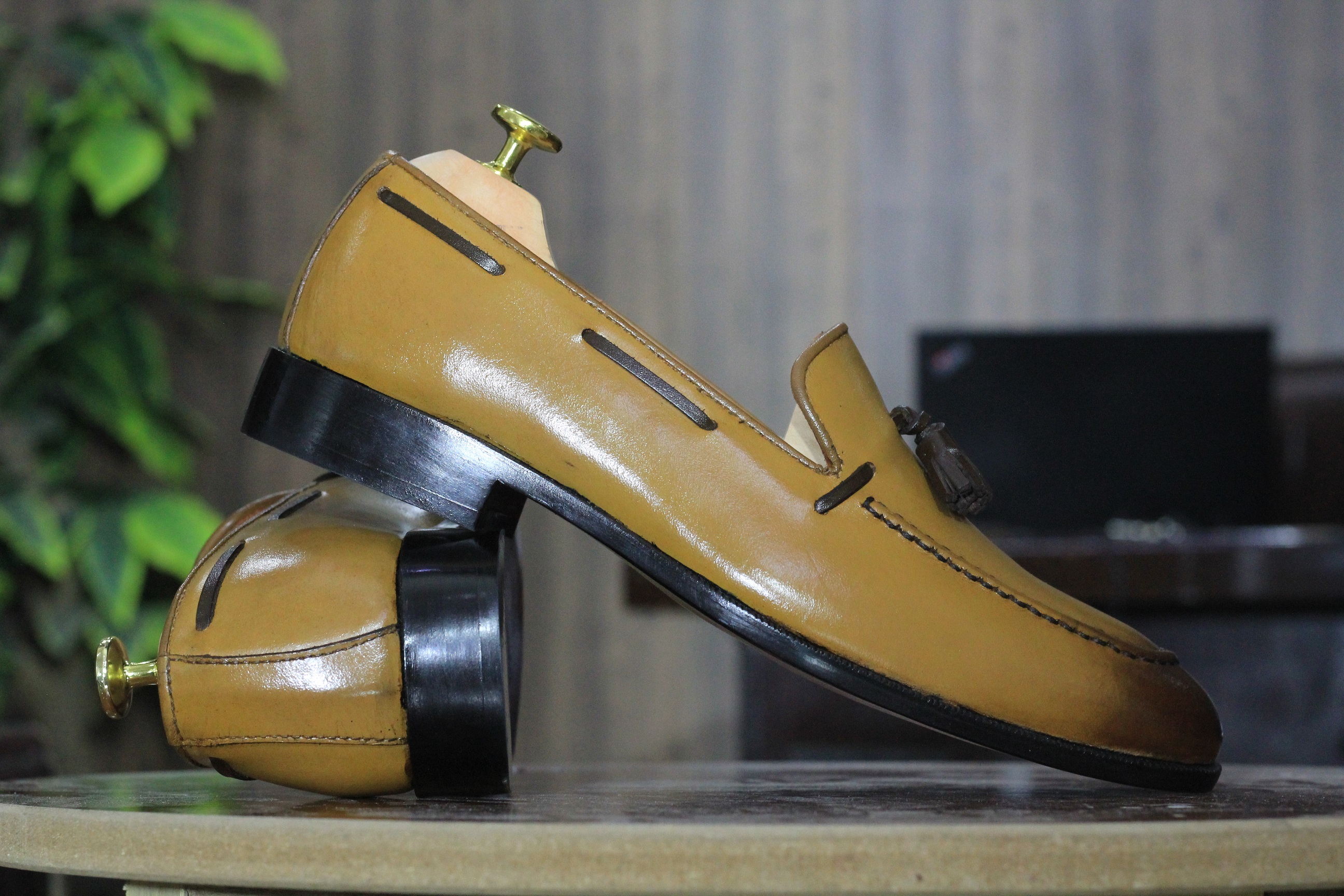Handmade Tan Slip On Moccasin Shoes, Men's Leather Loafer tussle Shoes
