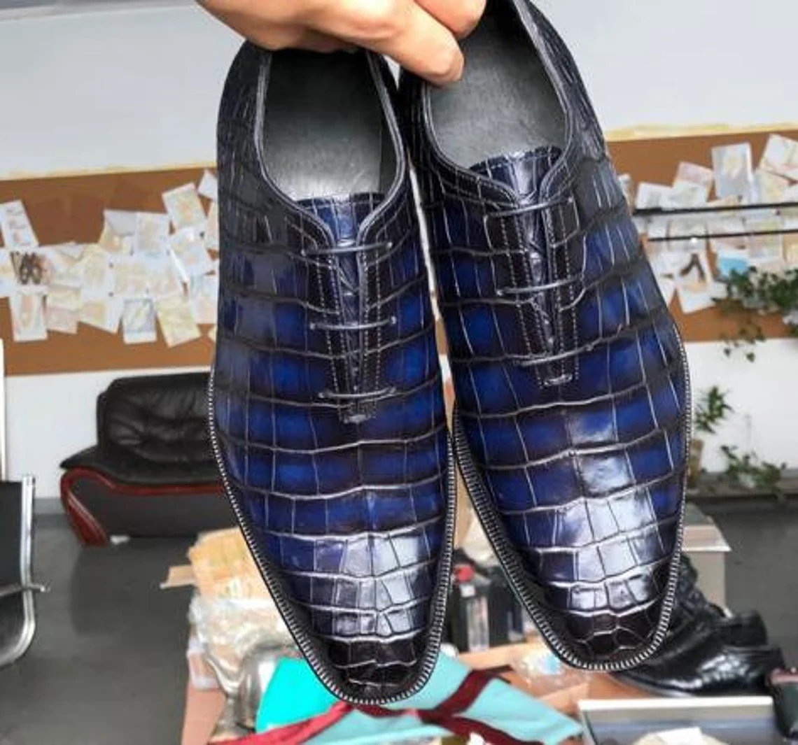 New Pure Handmade Blue Alligator Texture Lace Up Shoes For Men's