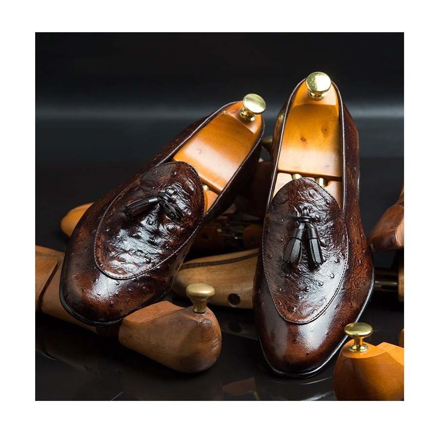 Handmade Dark Brown Ostrich Loafer Tussle Men's Leather Shoes