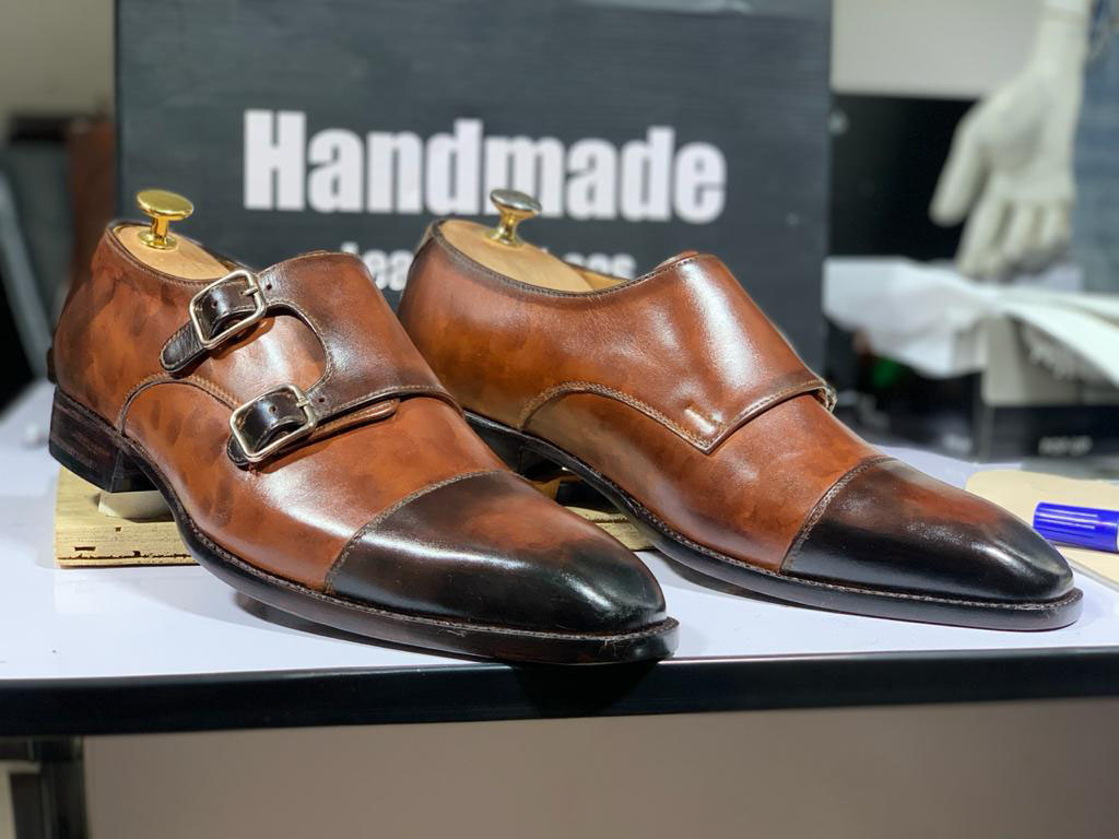 Handmade Two Tone Brown Double Buckle Shoes, Cap Toe Shoes, Classic Party Shoes