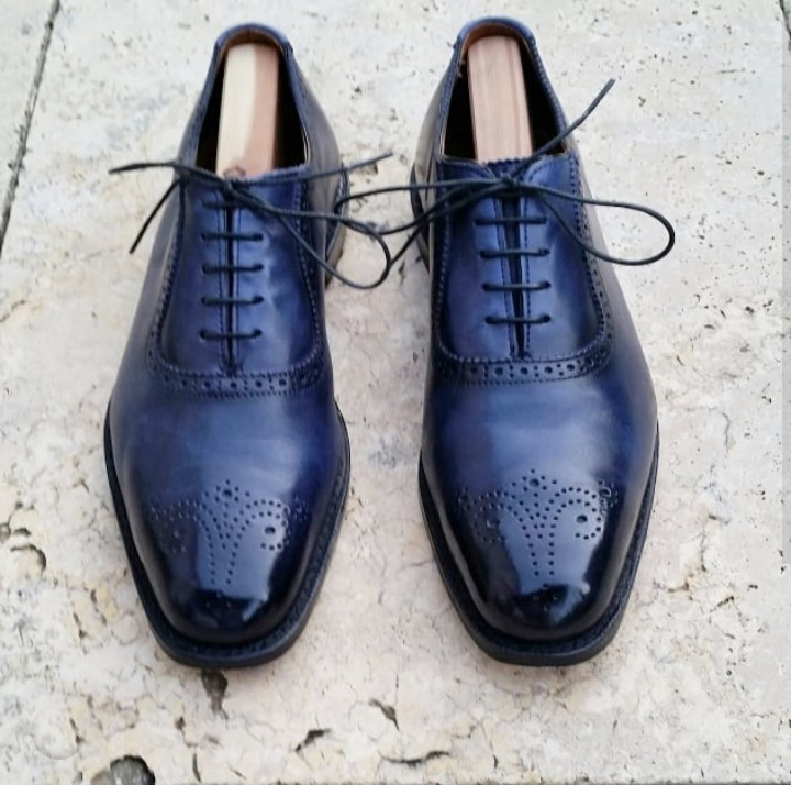 Handmade Men's Brogue Shoes Men's Navy Blue Leather Lace Up Shoes