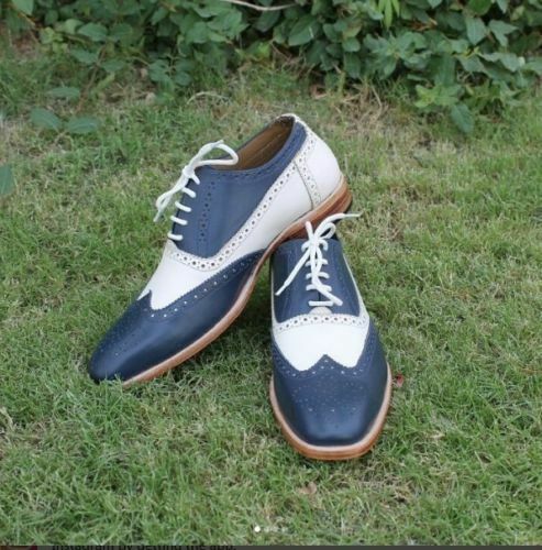 Handmade Two Tone Wing Tip Lace Up Leather Dress Shoes For Men's