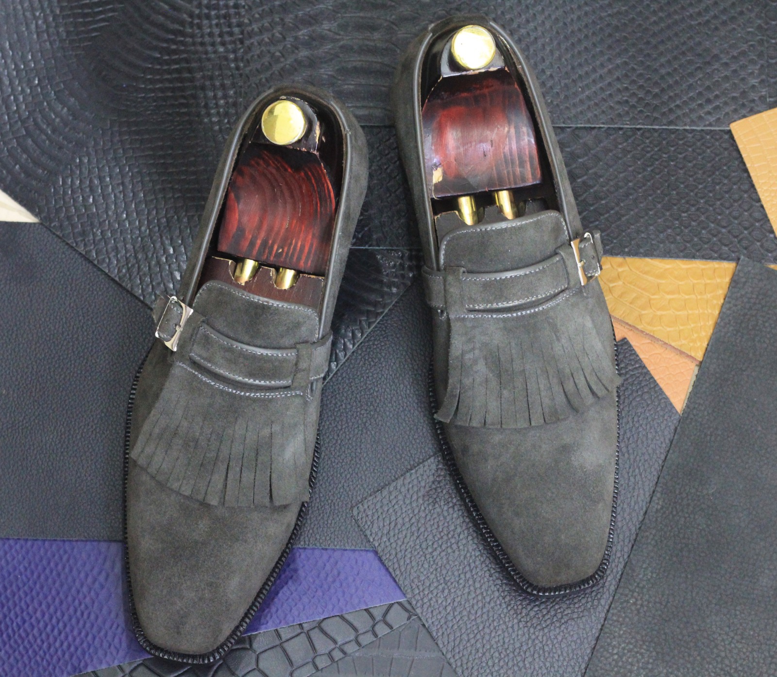 Handmade Gray Colour Fringe Buckle Shoes, Men's Classic Suede Shoes