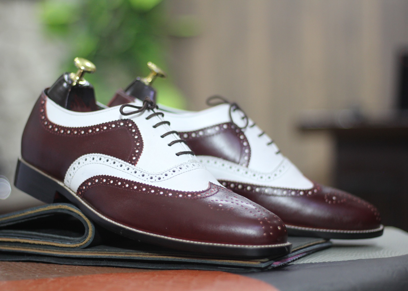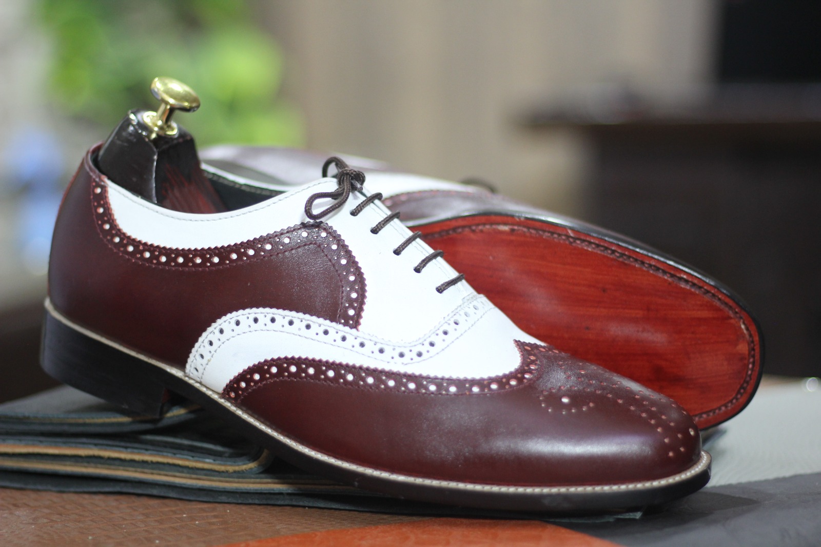 Men's Bespoke Two Tone Wing Tip Genuine Leather Shoes, Men's Lace Up and Brogue Toe Shoes, Men's Dress Formal Shoes