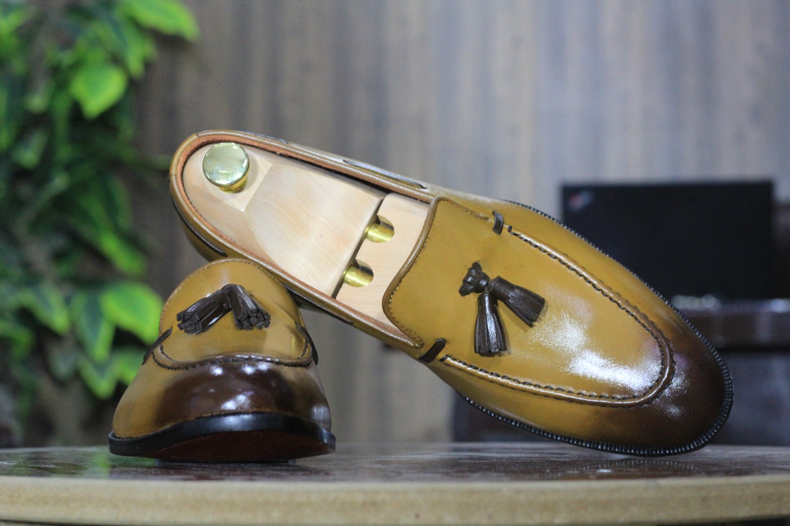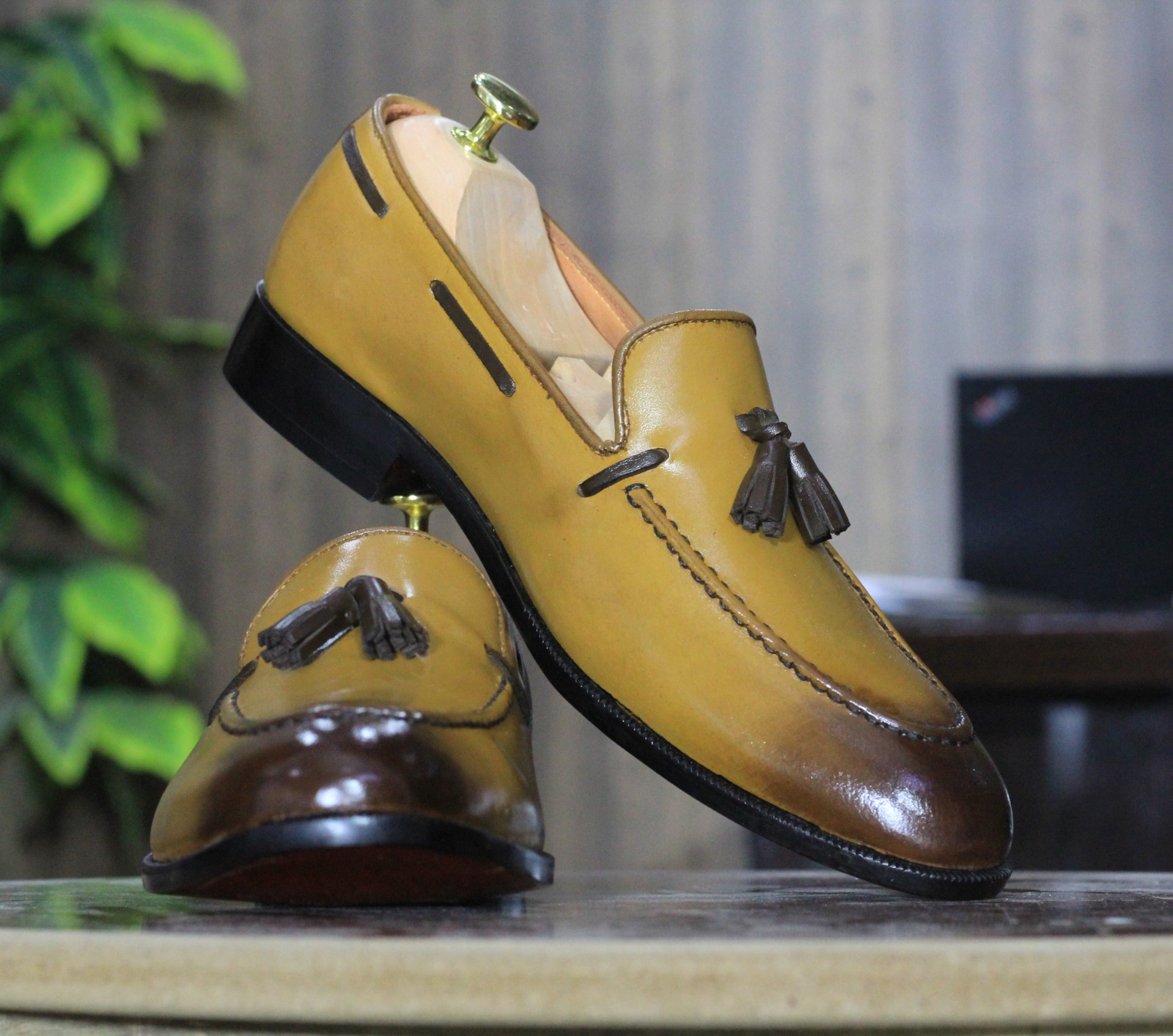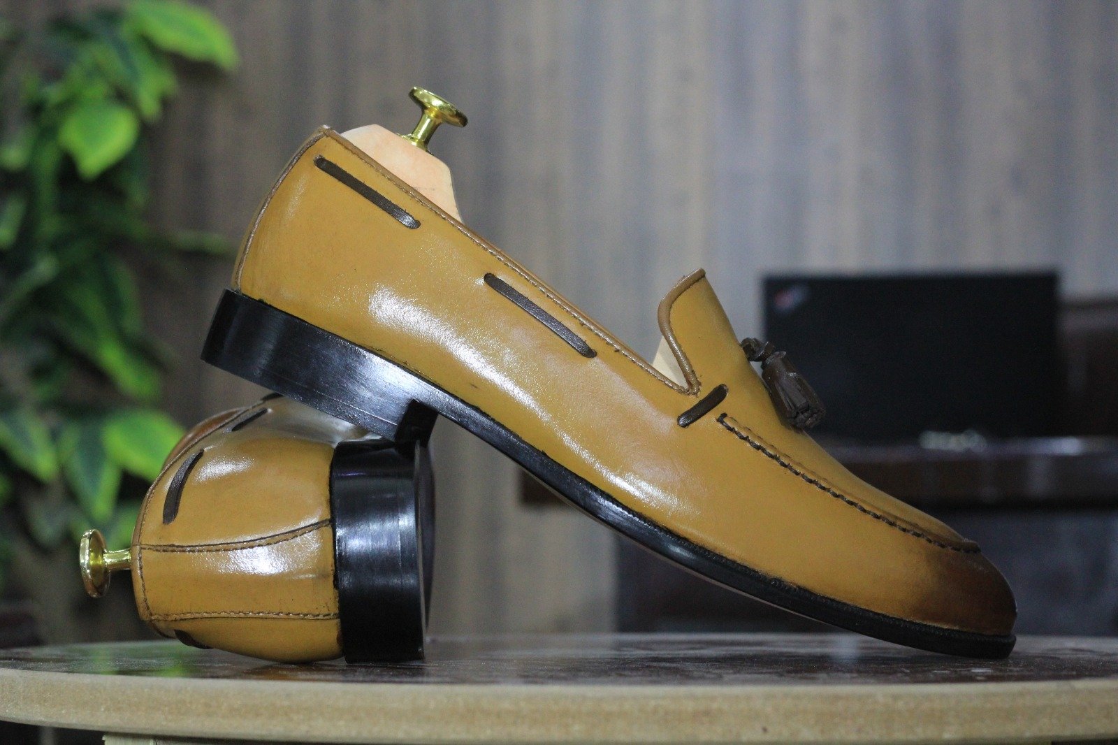 Men's Bespoke Mustard Brown Genuine Leather Shoes, Men's Tussle Loafer Shoes, Men's Party Wear Shoes