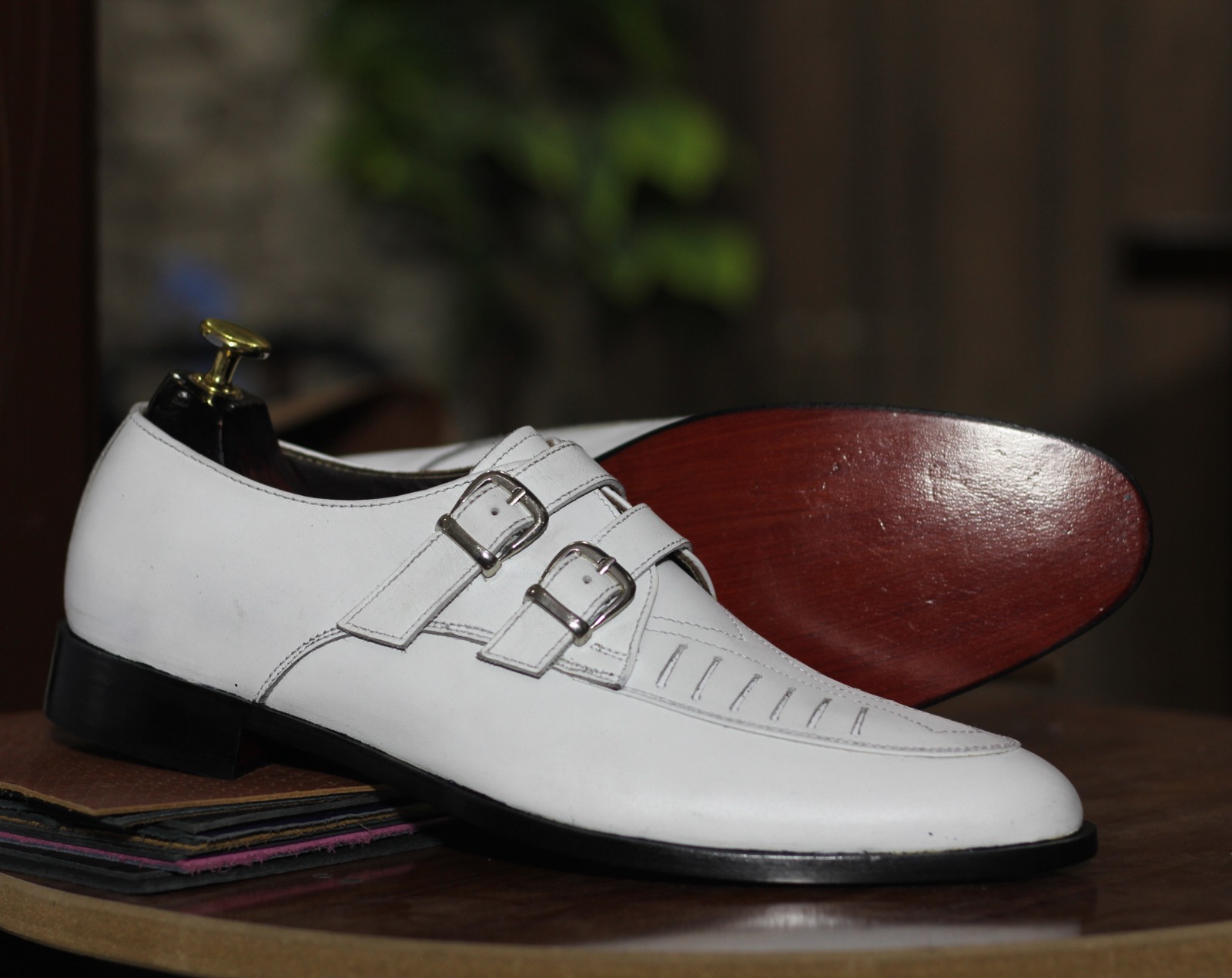 White Colour Double Buckle Shoes,Men's Genuine Leather Hand Painted Classic Shoes