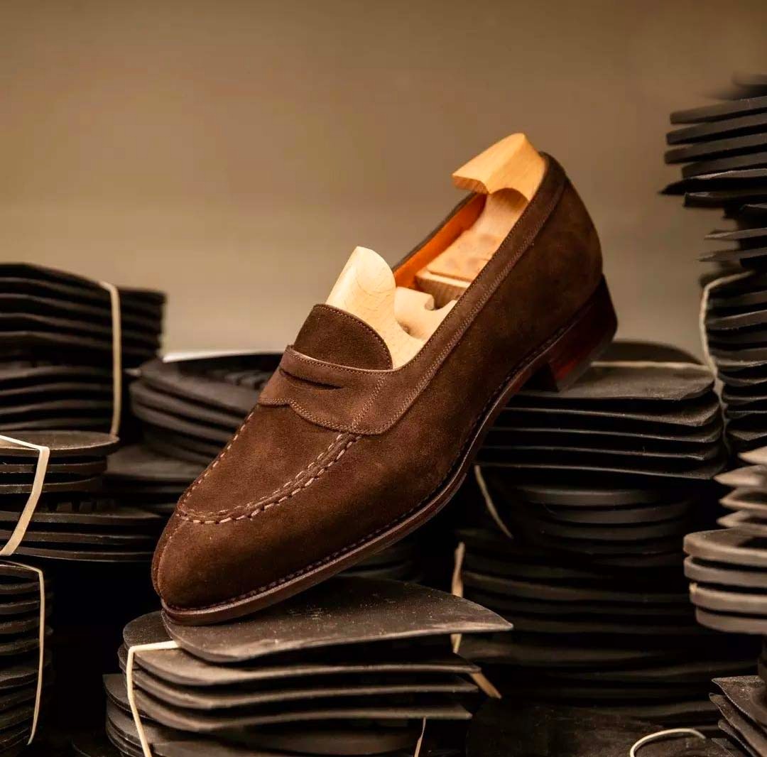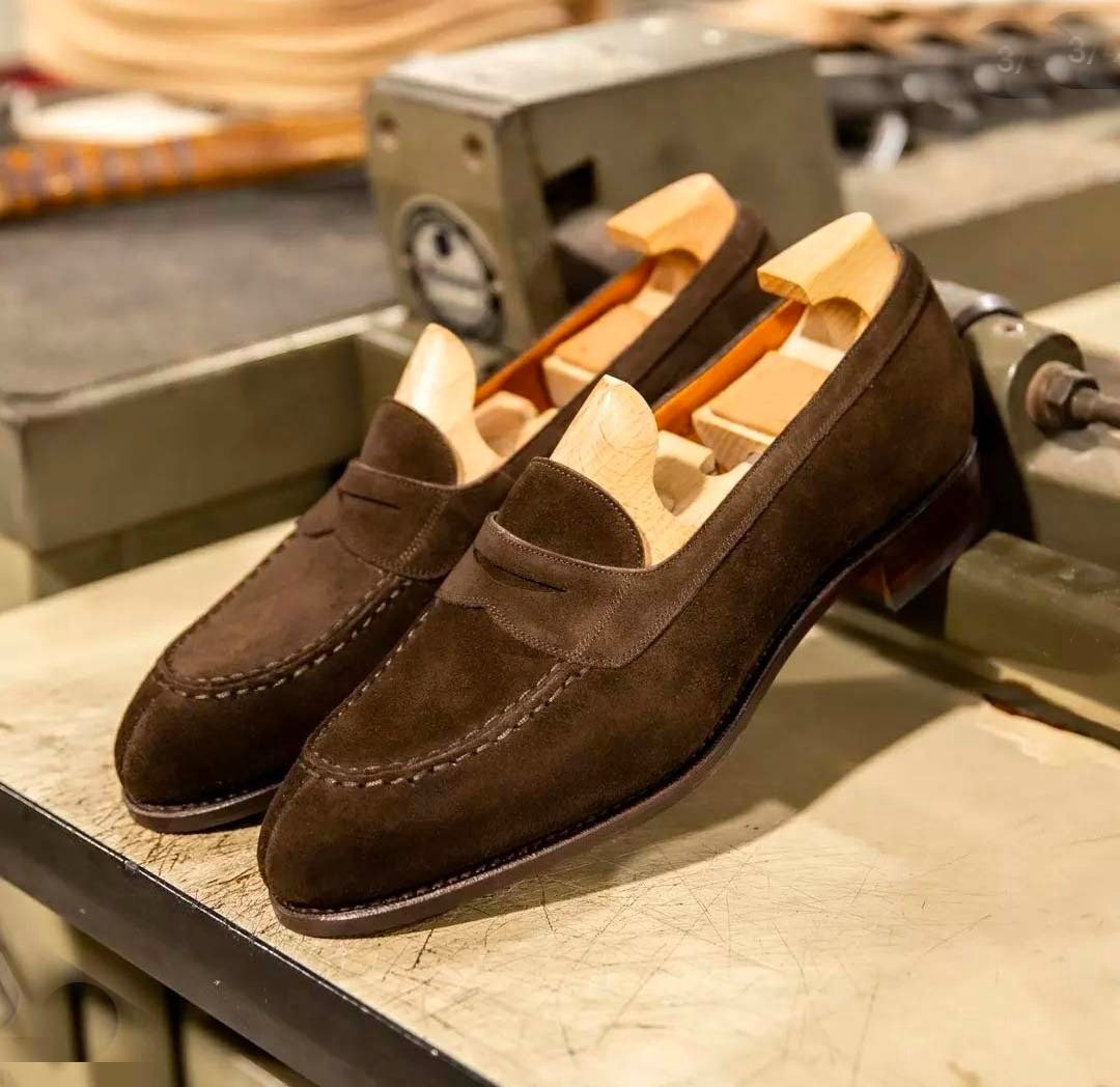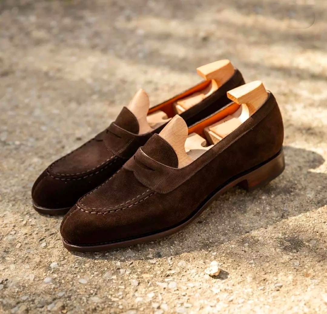 Handmade Penny Loafer Suede Dark Brown Slip On Moccasion Shoes for Men's