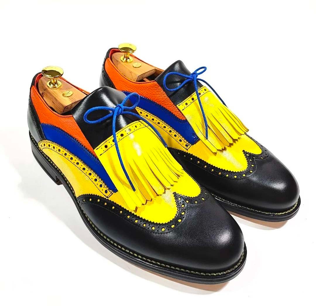 Multi Colour Fringe Loafer Wing Tip Leather Hand Painted Shoes for Men's