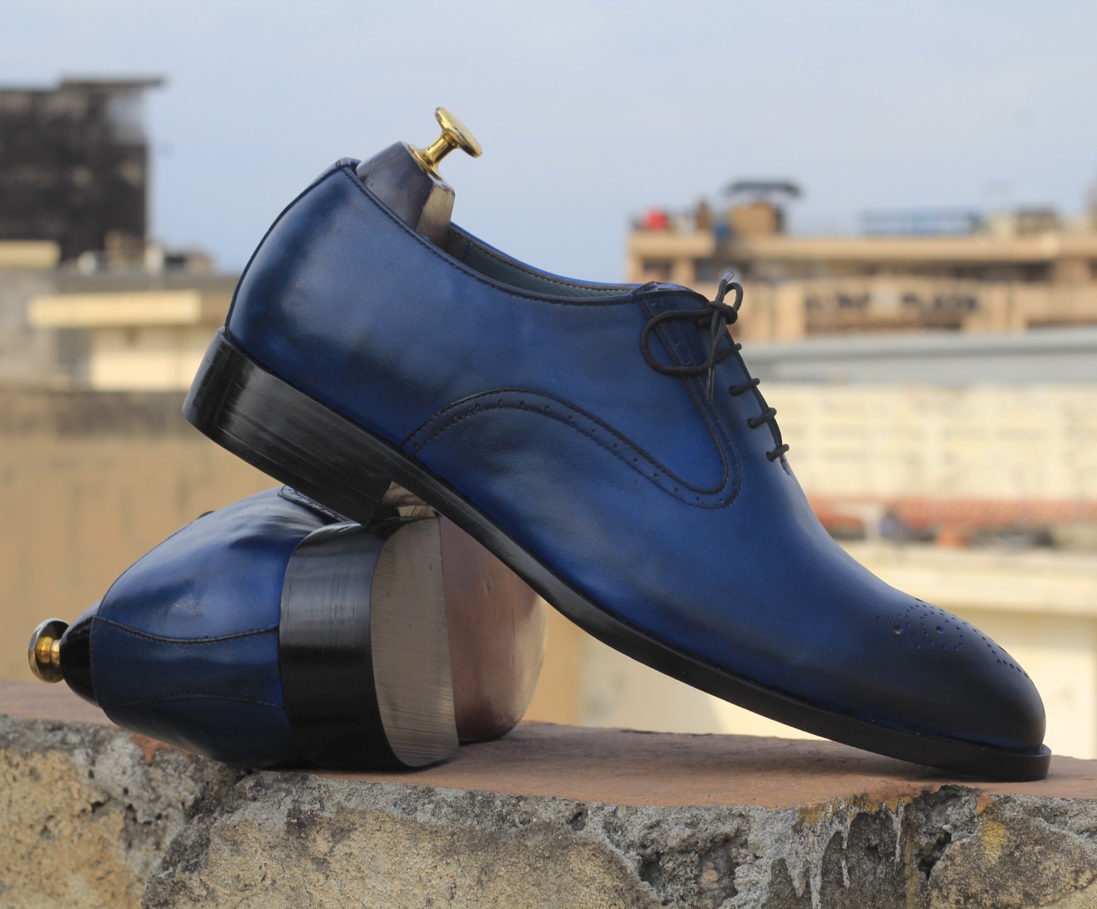 Two Tone Blue Hand Painted Genuine Leather Brogue Toe Shoes,Men's Formal Lace Up Shoes