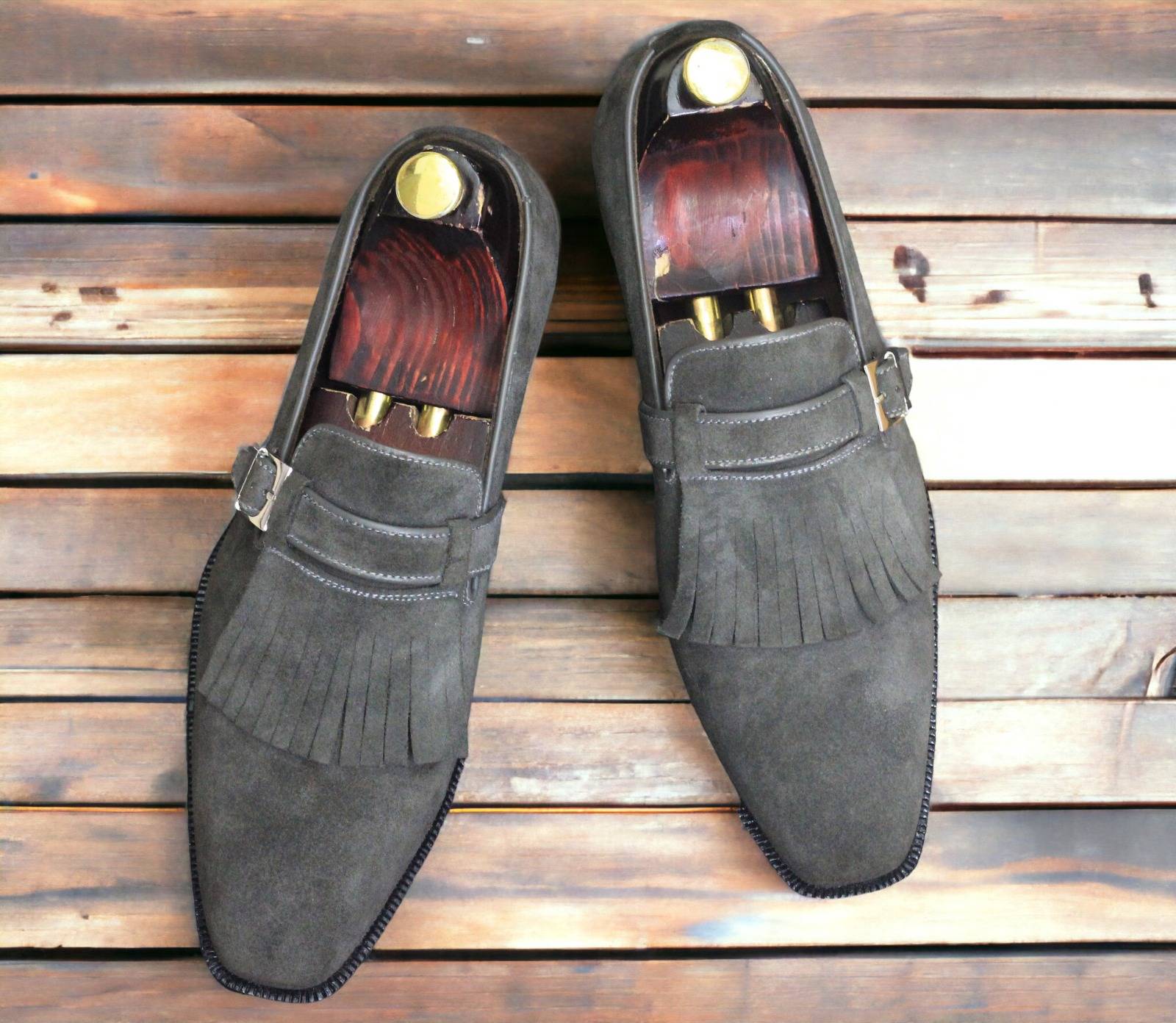 Men's Bespoke Grey Colour Suede Fringe Buckle Shoes