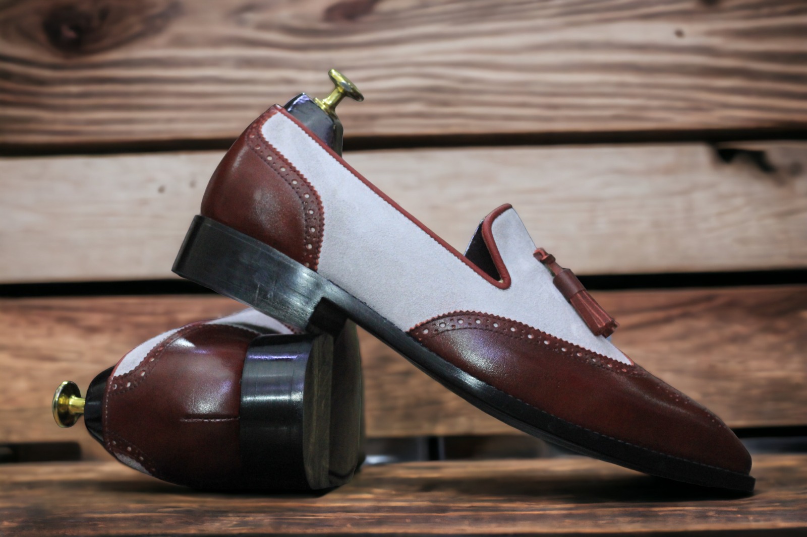 Handmade Two Tone Tussle Loafer Wing Tip Leather Suede Brogue Toe Shoes for Men's