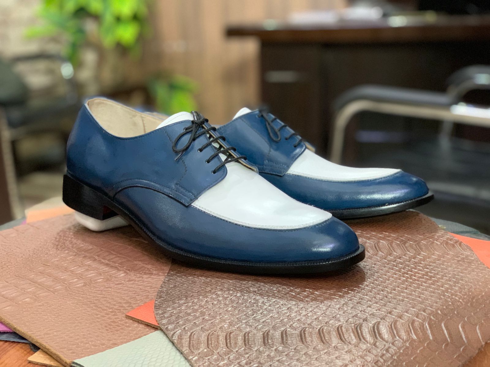 Men's Bespoke Handmade Blue White Derby Style Lace Up Shoes