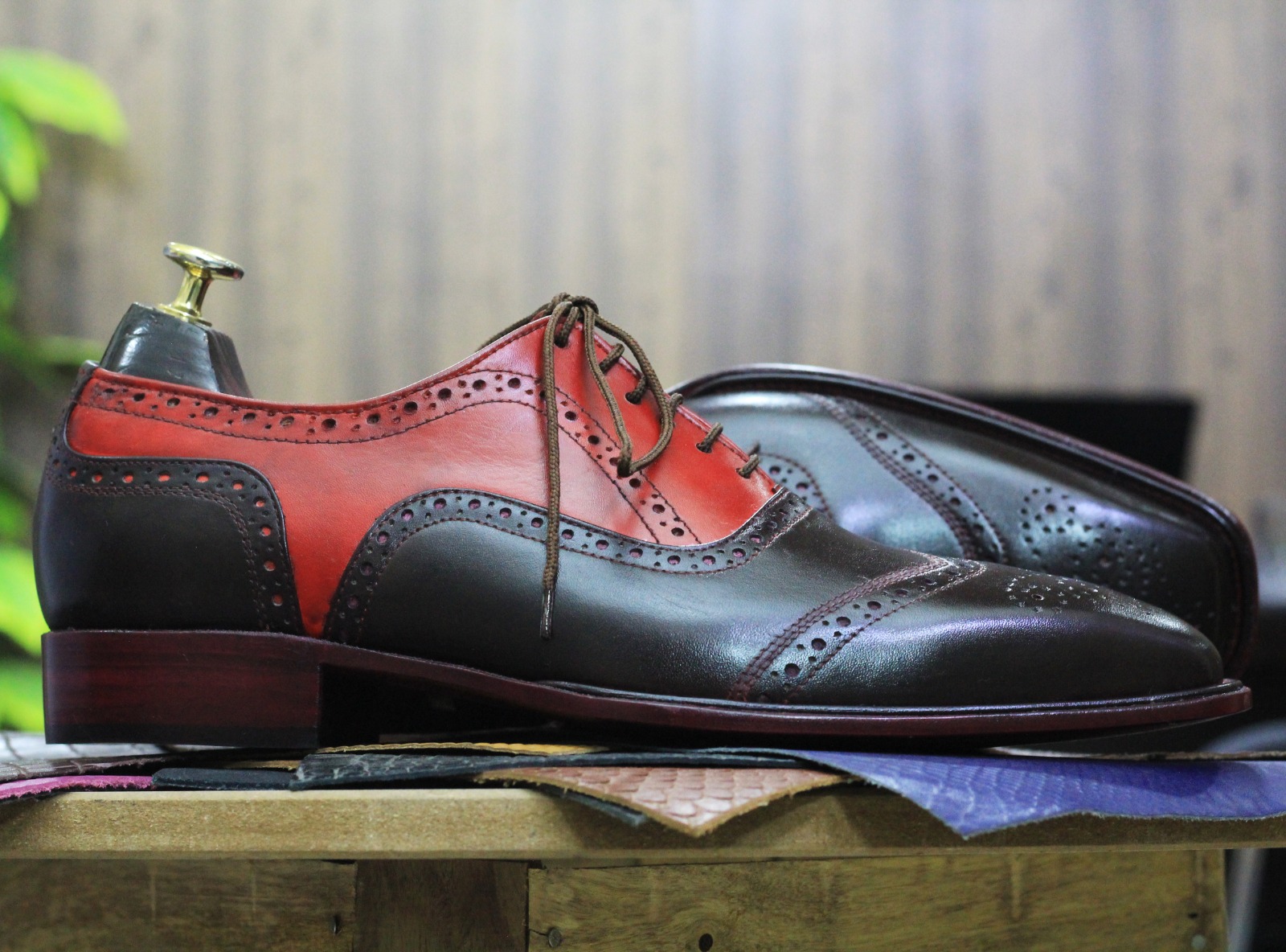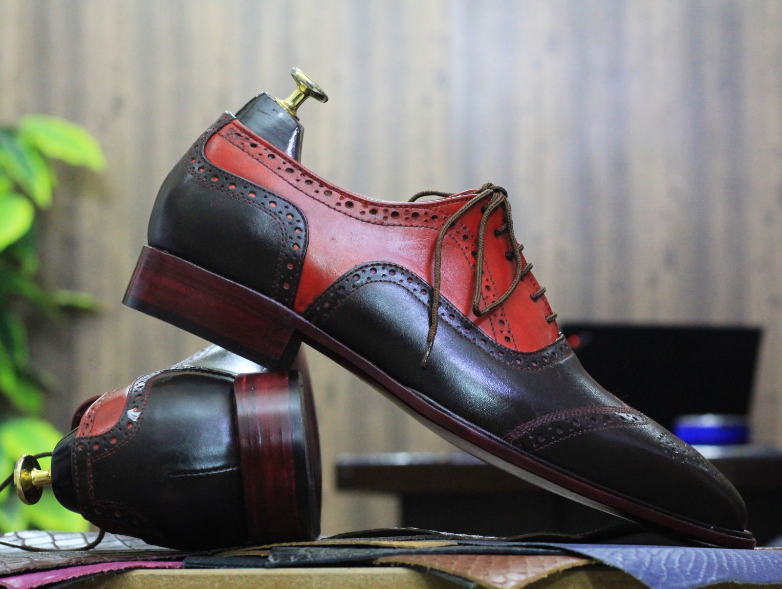 Black and Red Genuine Handmade Leather Lace Up Men's Wing Tip Brogue Toe Shoes