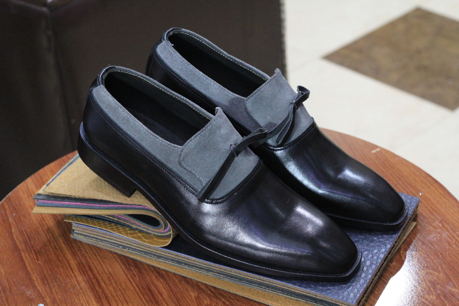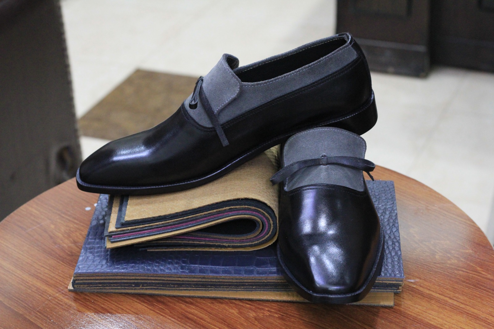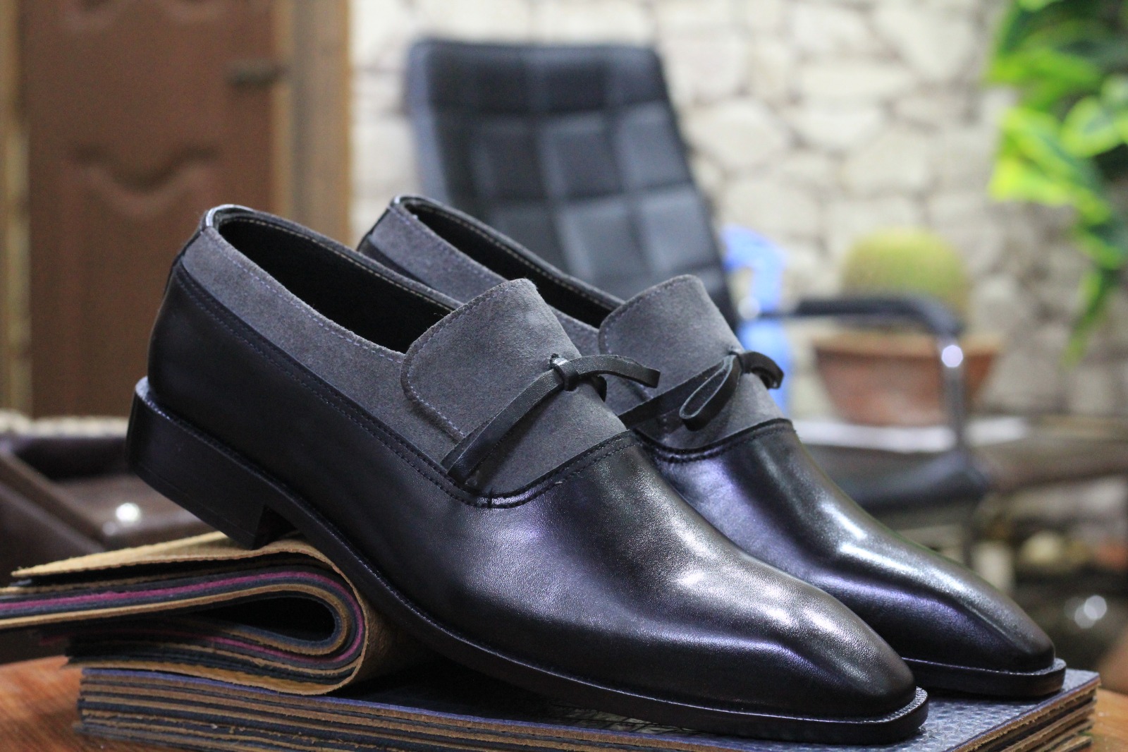 Men's Handmade Black and Grey ColourTussle Loafer Plane Toe Style Leather Suede Shoes