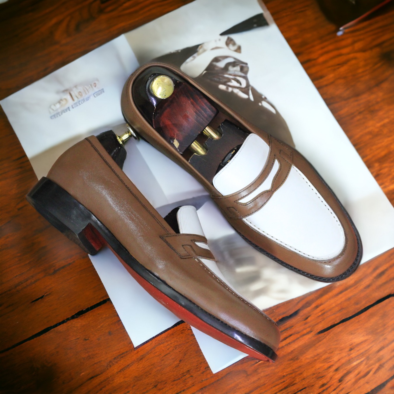 Handmade Penny Loafer Style Brown White Color Pure Leather Mocassin Shoes
