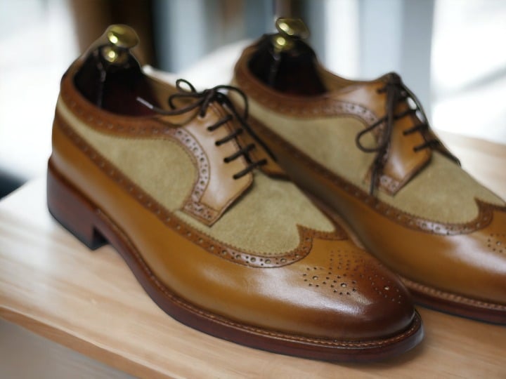 Handmade Brown Beige Suede Leather Wing Tip Lace Up Dress Shoes