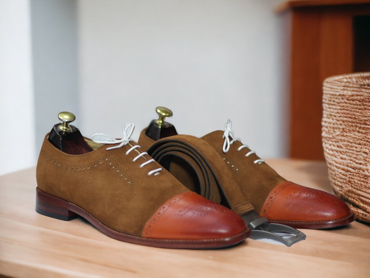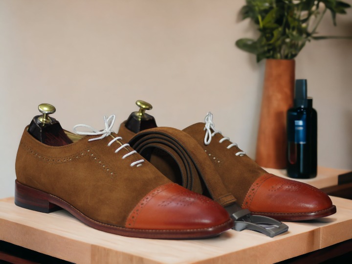 Handmade Tan Leather & Brown Suede Shoes, Cap Toe Lace Up Dress Shoes
