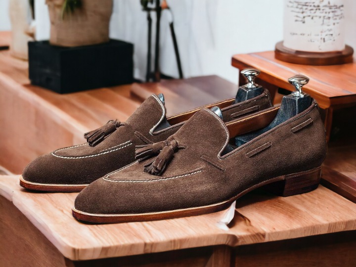 Handmade Men's Brown Suede Tussle Loafers Shoes, Slip On Moccasin Shoes