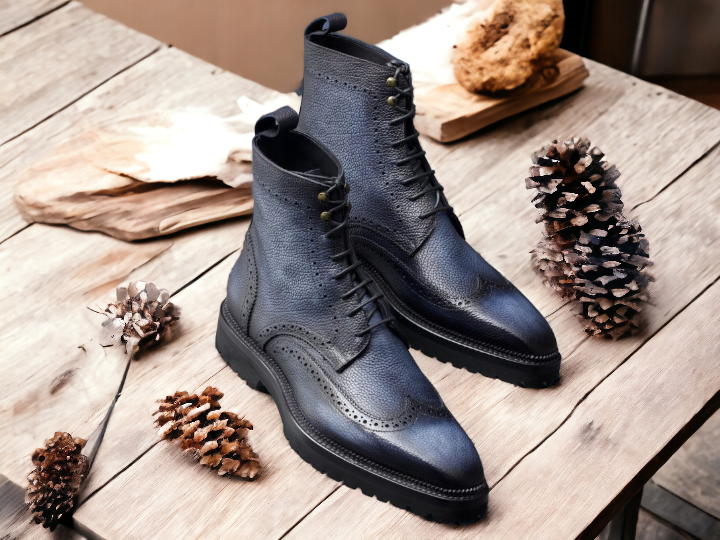 Handmade Men's Blue Leather Lace up Wing tip Ankle Boot