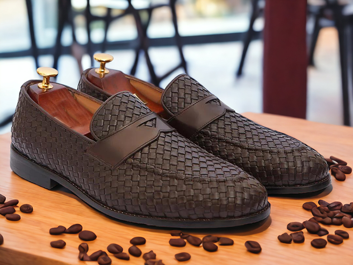 Handmade Brown Woven Texture Shoes, Men's Penny Loafer Shoes
