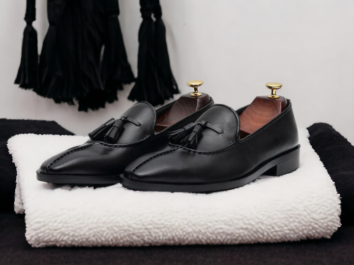 Men's Handmade Black Genuine Leather Shoes, Slip On Moccasin Loafer Tussle Shoes