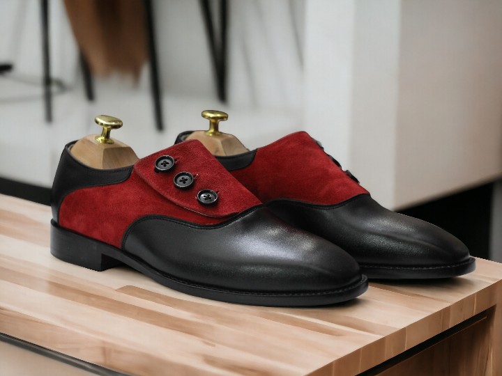 Handmade Men's Black Red Leather Suede Side Button Shoes