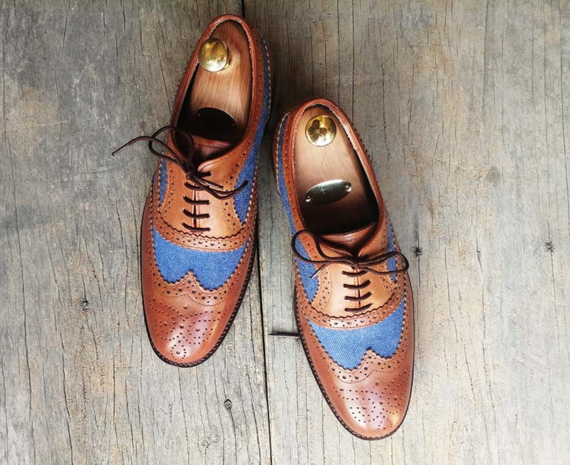 Handmade Men's Leather & Denim Brown & Blue Color Wing Tip Brogue Lace Up Shoes