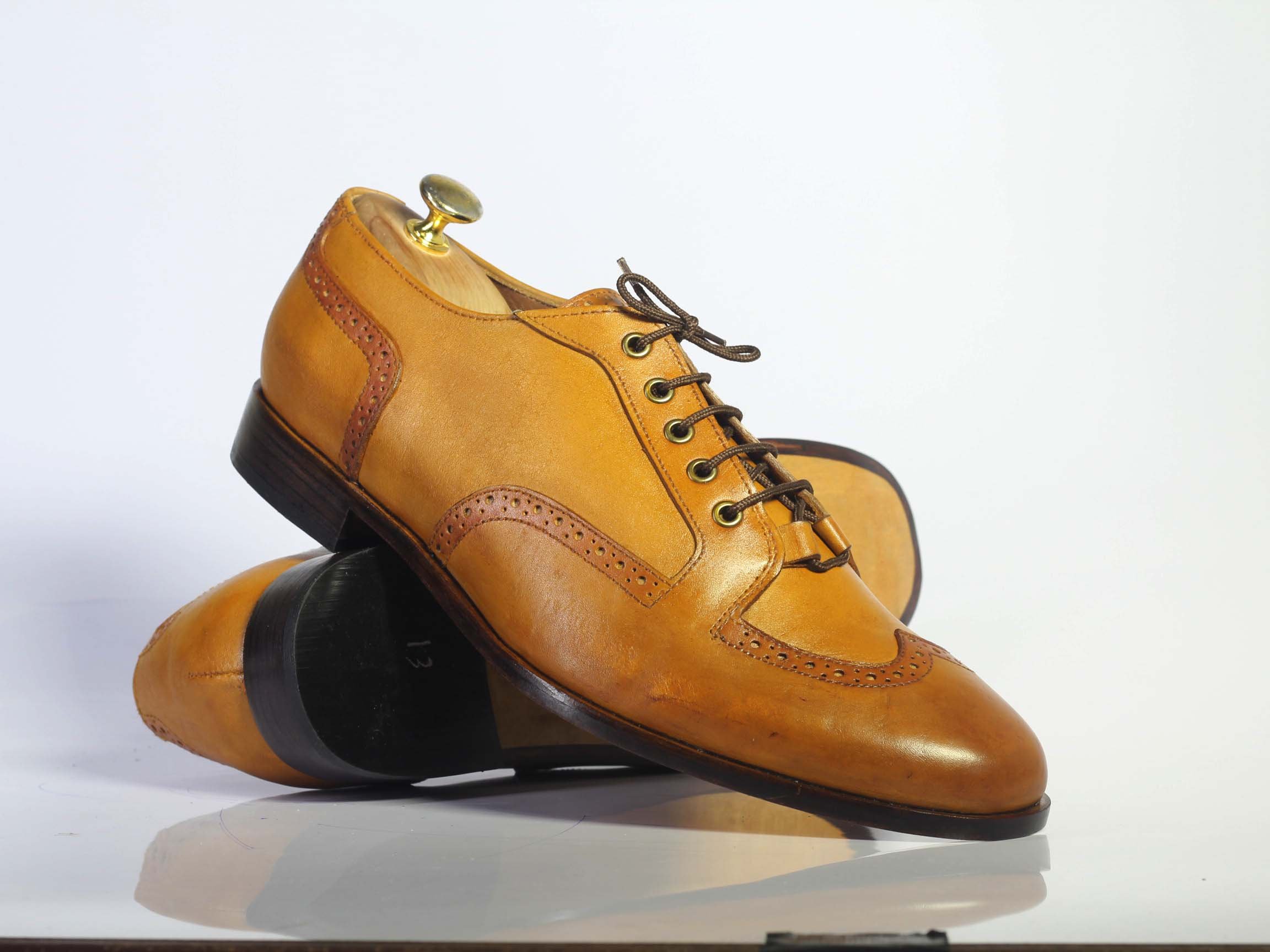 Handmade Men's Tan Color Wing Tip Leather Lace Up Shoes