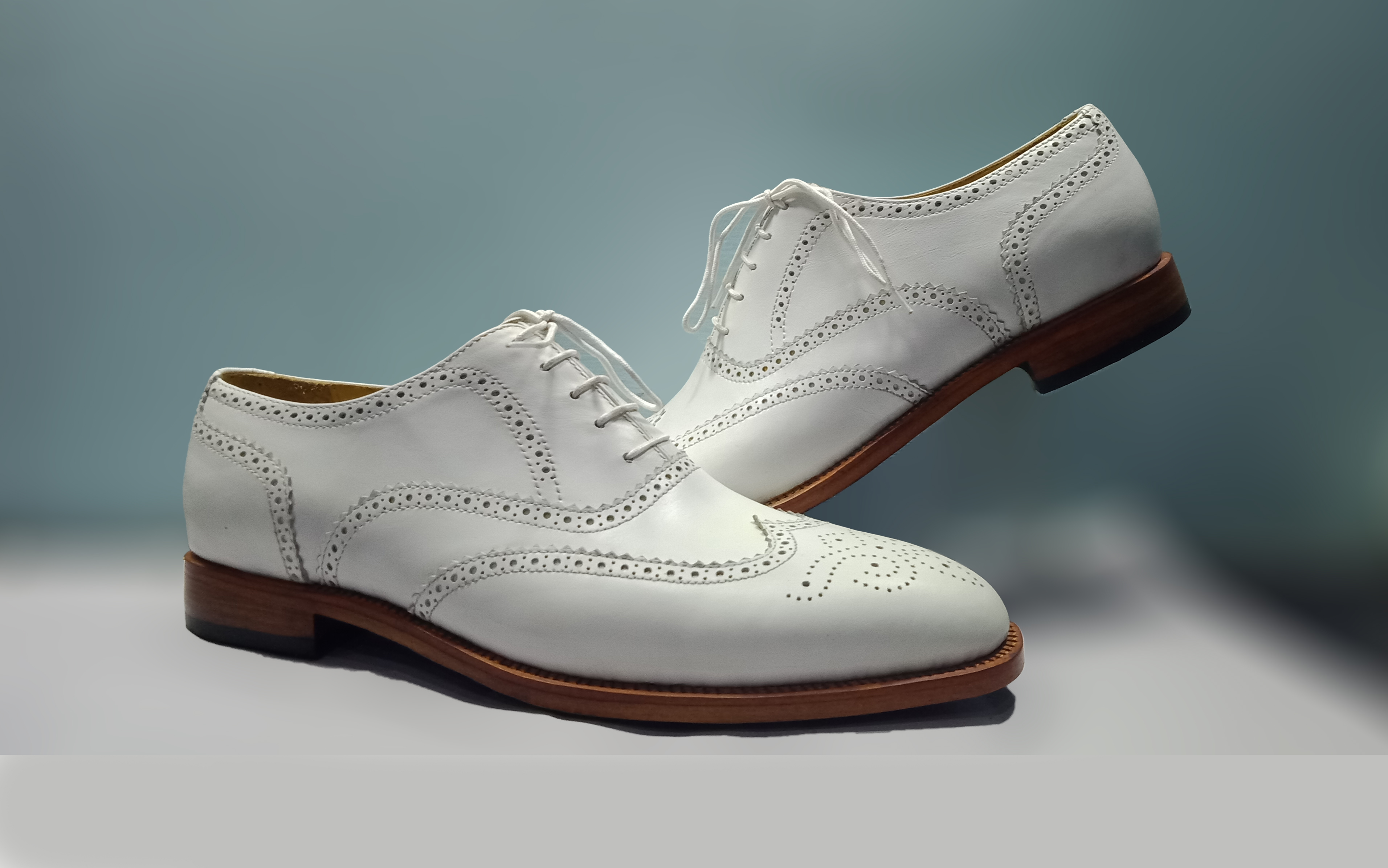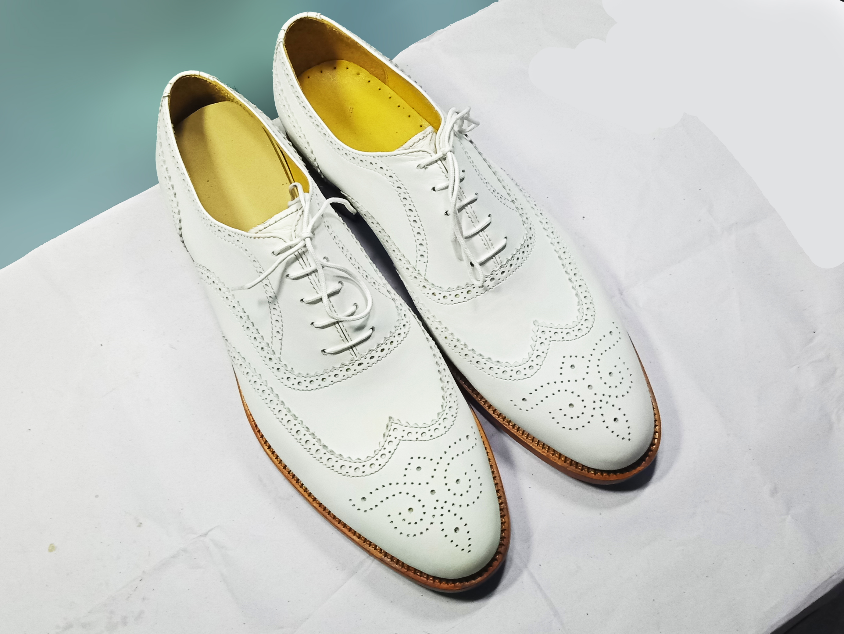 Handmade White Leather Stylish Wing Tip Brogue Lace Up Shoes For Men's