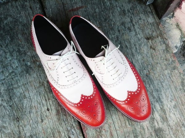 Handmade Red & White Leather Stylish Wing Tip Brogue Lace Up Shoes For Men's