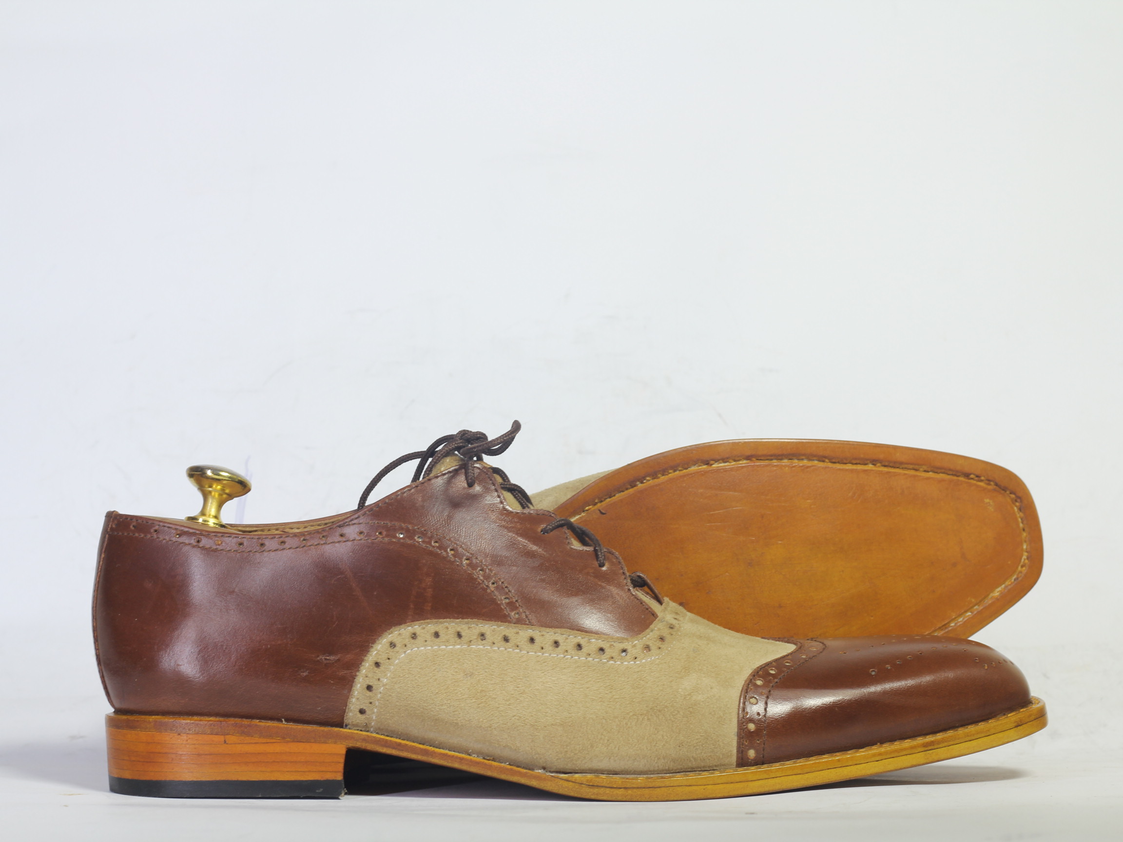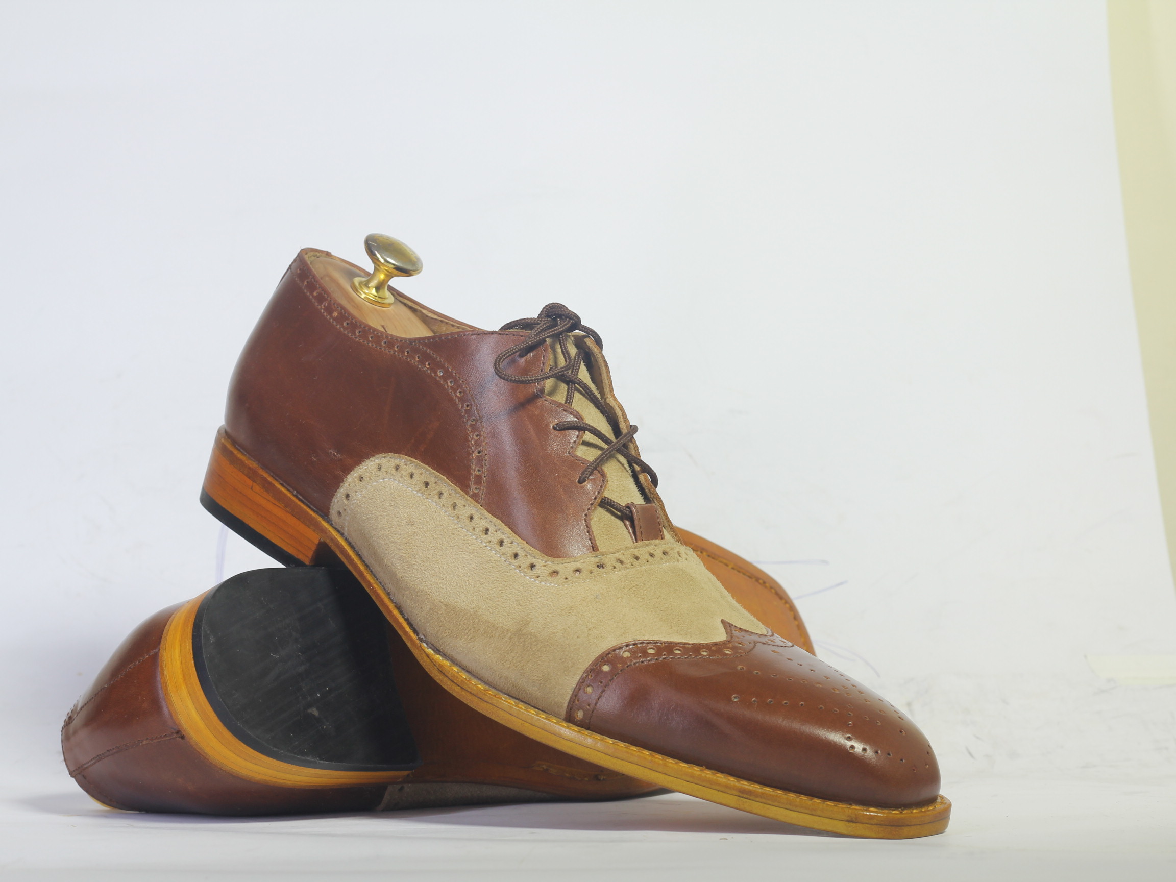 Handmade Brown & Beige Wing Tip Brogue Leather Suede Lace Up Shoes For Men's
