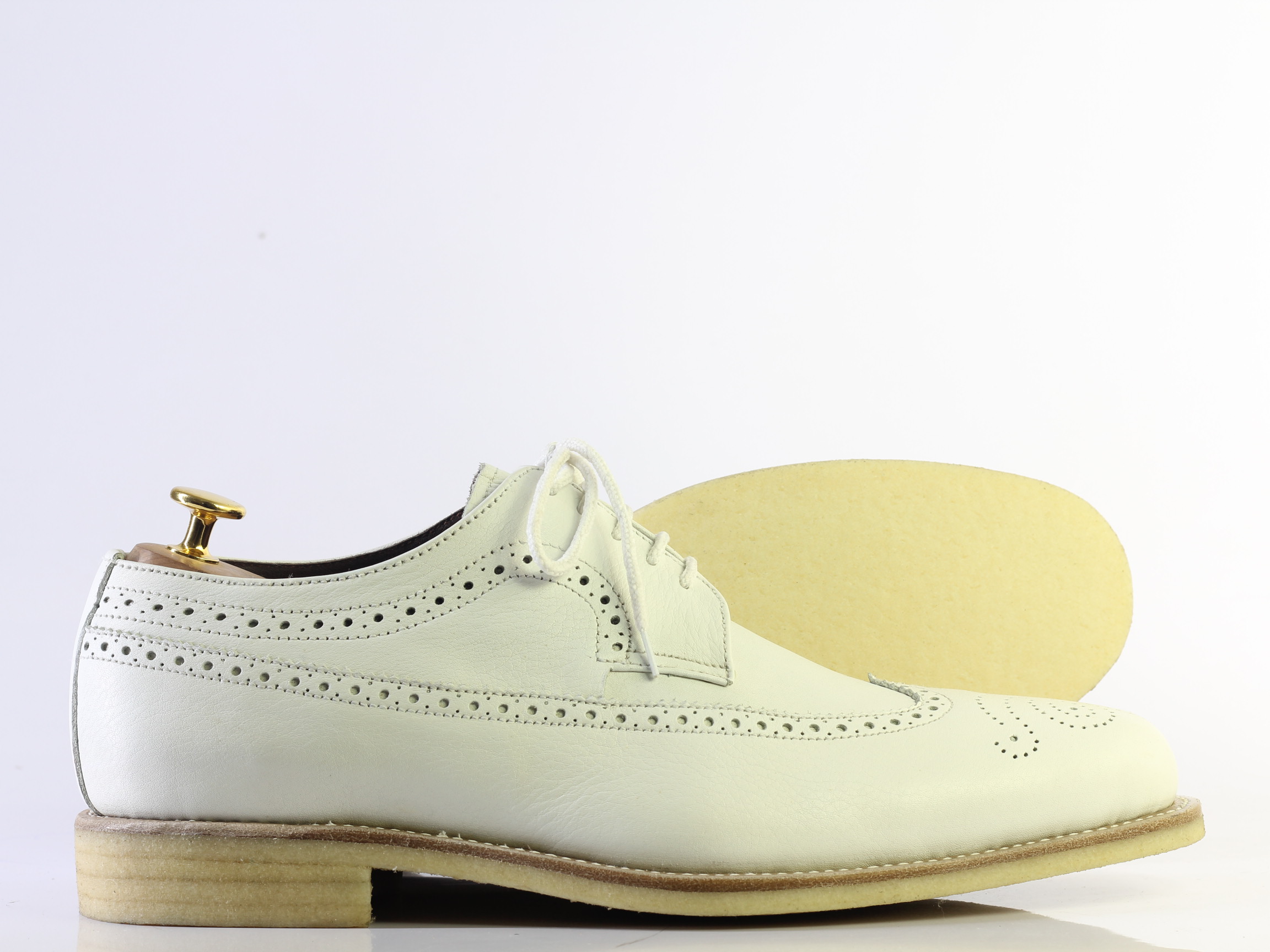 Handmade Men's White Color Wing Tip Brogue Leather Lace Up Shoes