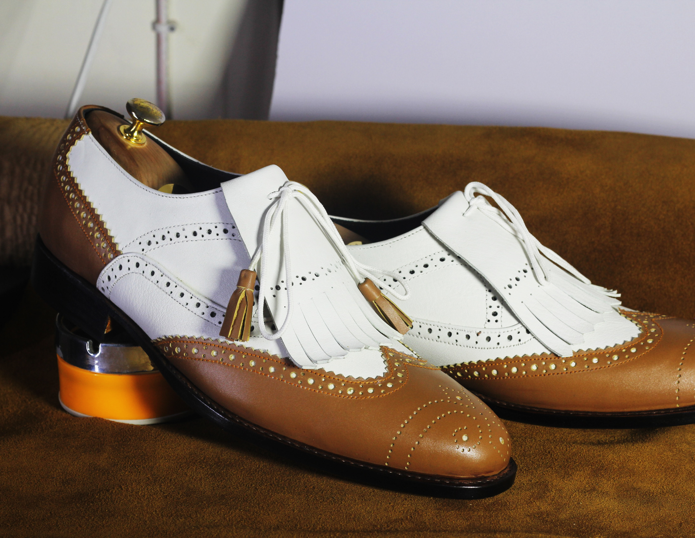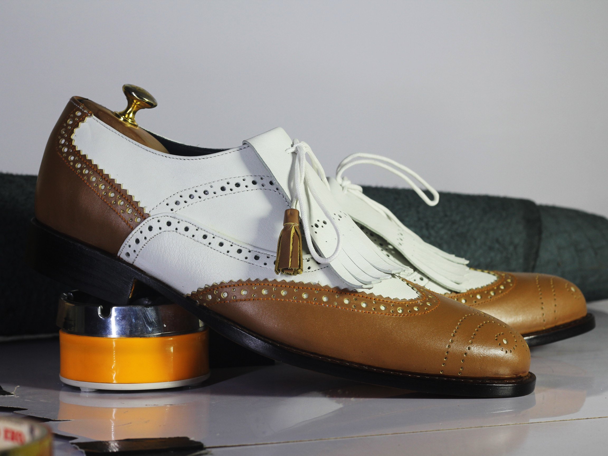 Handmade White & Brown Fringe Wing Tip Brogue Stylish Shoes For Men's