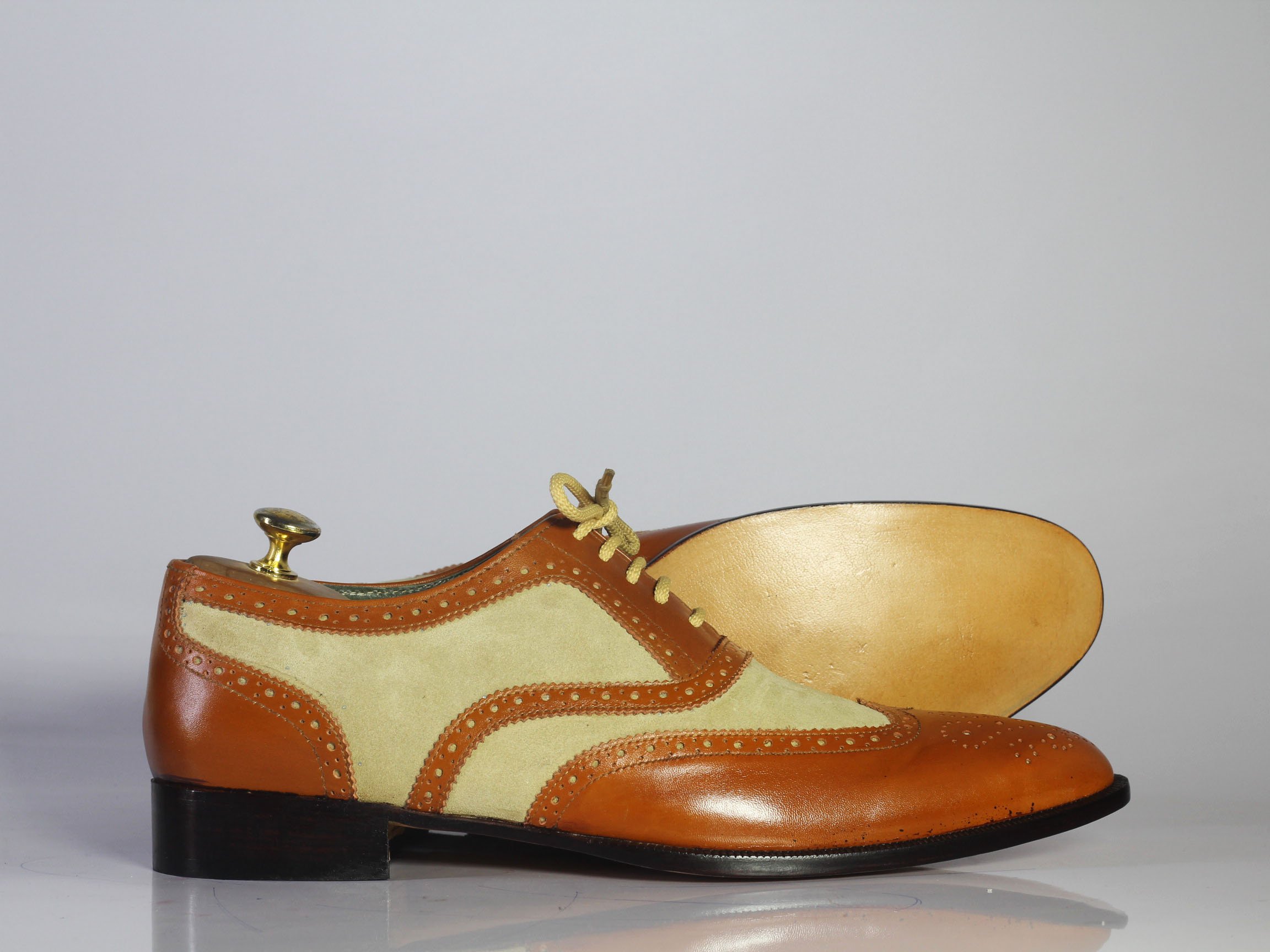 Handmade Men's Beige & Tan Leather Suede Wing Tip Brogue Dress Shoes