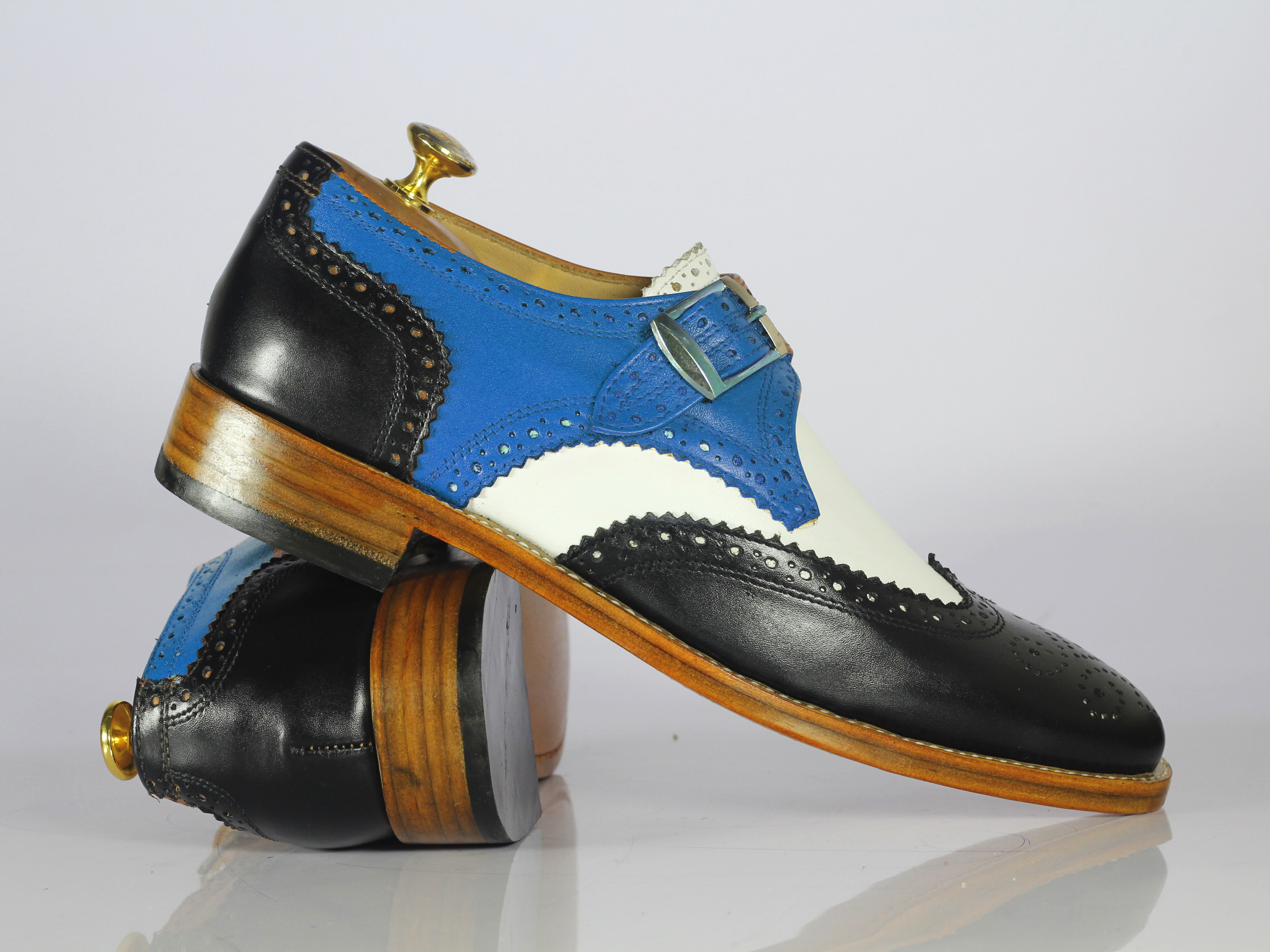 Handmade Multi Shades Leather Wing Tip Brogue Monk Strap Shoes For Men's