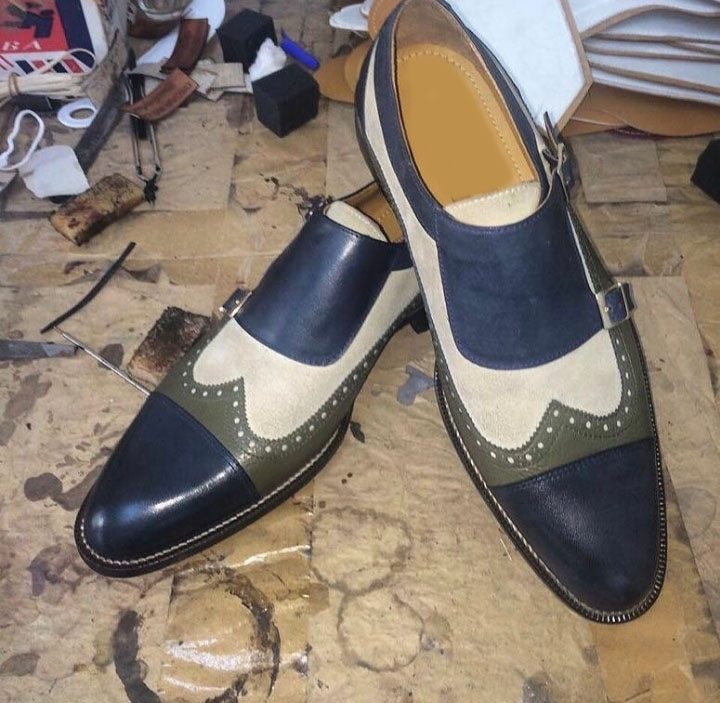 Handmade Multi Color Leather Suede Wing Tip Monk Strap Shoes For Men's