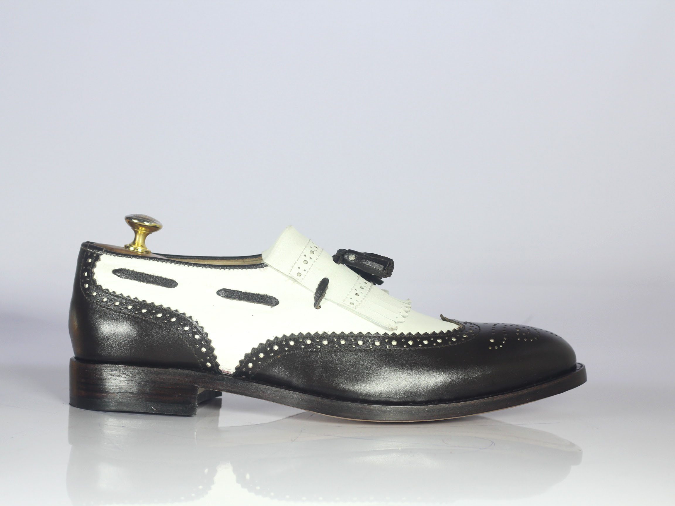 Handmade Black & White Leather Wing Tip Fringe Tussles Shoes For Men's