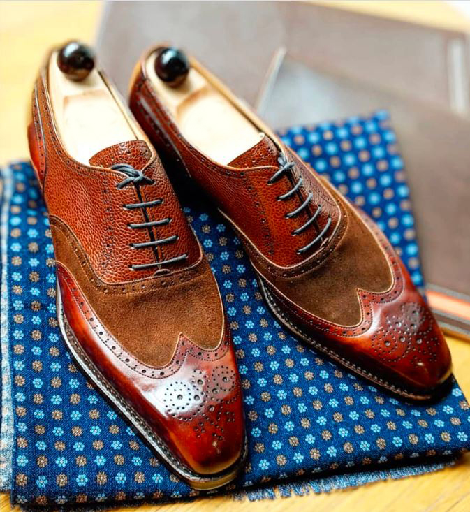 Men's Brown Color Leather & Suede Wing Tip Brogue Dress Shoes