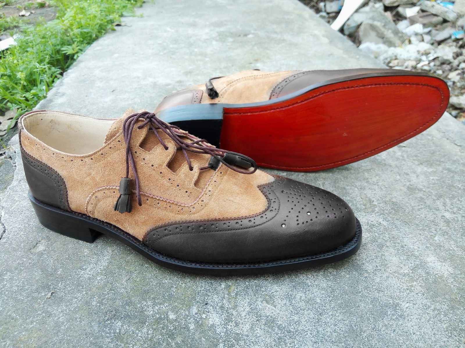 Handmade Men's Two Tone Wing Tip Brogue Suede leather Formal Shoes