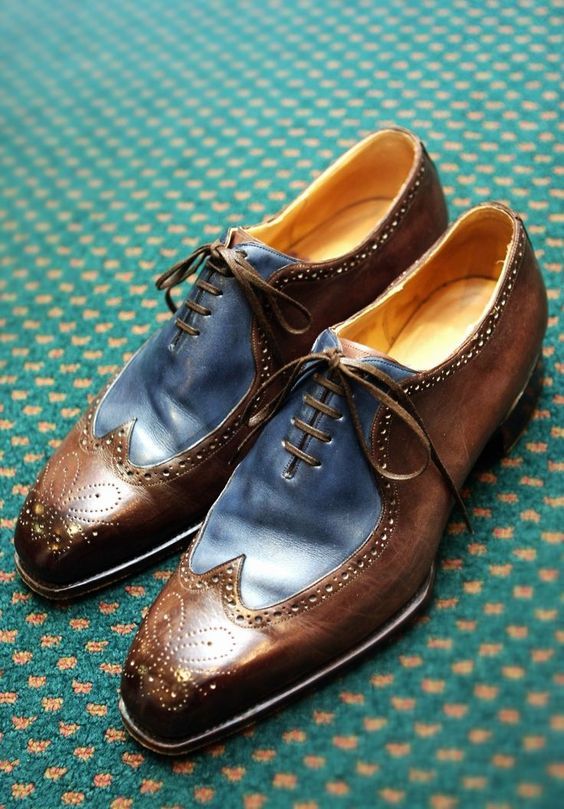 Bespoke Men's Blue & Brown Leather Shoes, Classic Wing Tip Brogue Dress Lace Up Handmade Shoes