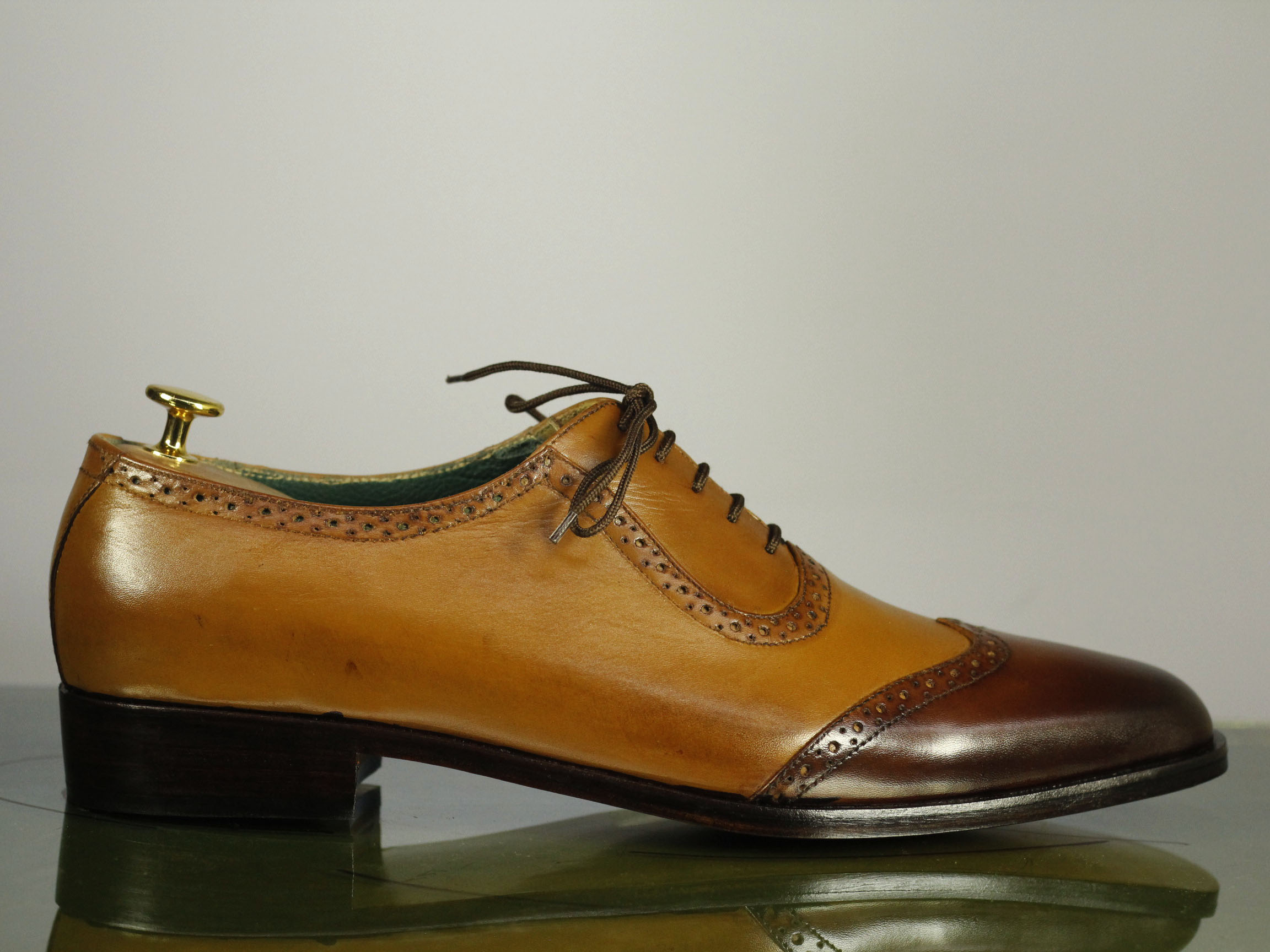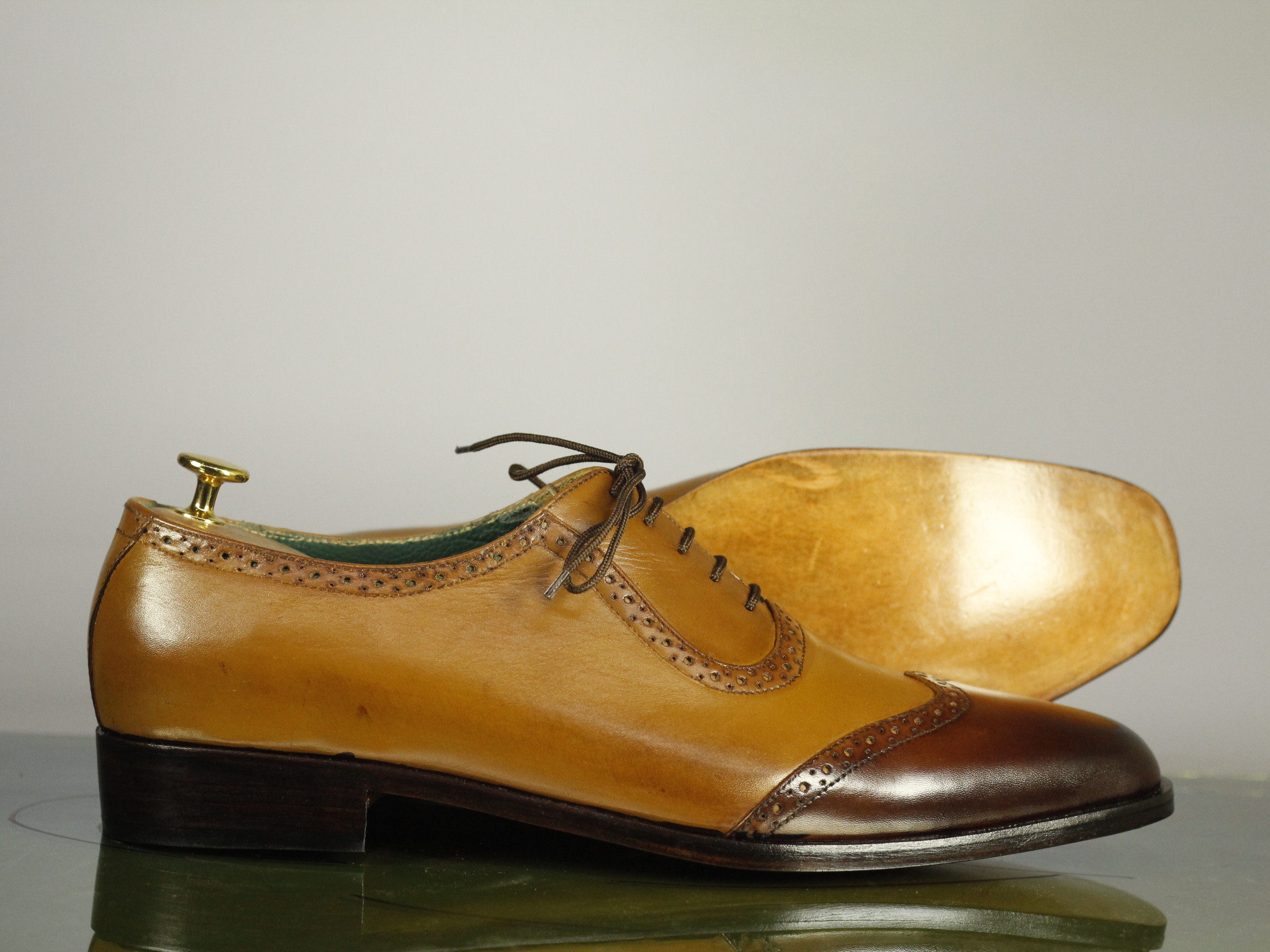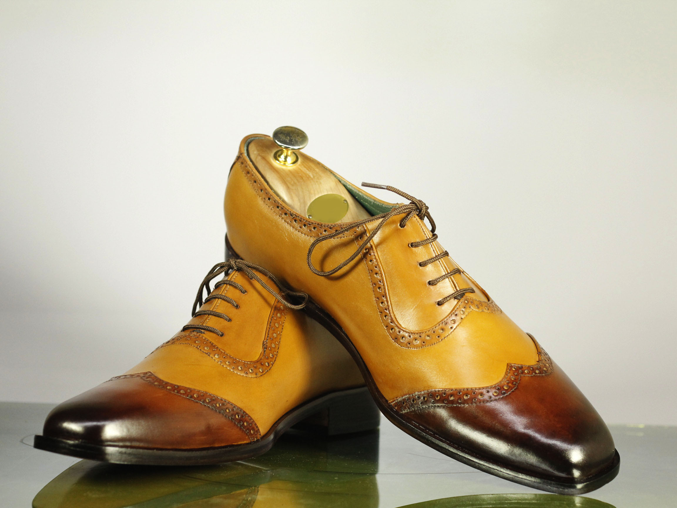 Handmade Two Tone Wing Tip Leather Lace Up Dress Shoes For Men's